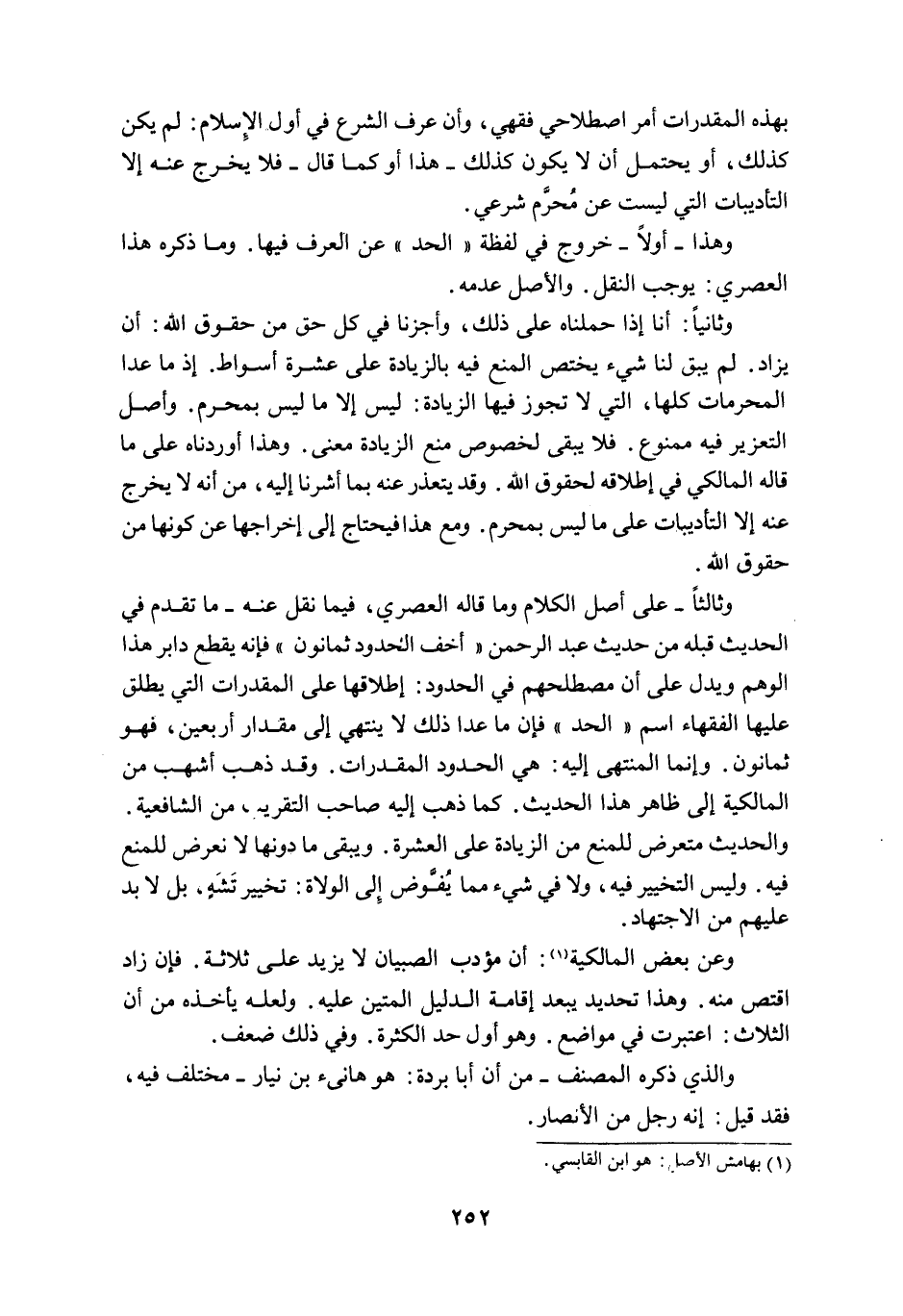 وَثَالِثًا - عَلَى أَصْلِ الْكَلَامِ وَمَا قَالَهُ الْعَصْرِيُّ، فِيمَا نُقِلَ عَنْهُ - مَا تَقَدَّمَ فِي الْحَدِيثِ قَبْلَهُ مِنْ حَدِيثِ عَبْدِ الرَّحْمَنِ " أَخَفُّ الْحُدُودِ ثَمَانُونَ " فَإِنَّهُ يَقْطَعُ دَابِرَ هَذَا الْوَهْمِ وَيَدُلُّ عَلَى أَنَّ مُصْطَلَحَهُمْ فِي الْحُدُودِ: إطْلَاقُهَا عَلَى الْمُقَدَّرَاتِ الَّتِي يُطْلِقُ عَلَيْهَا الْفُقَهَاءُ اسْمَ " الْحَدِّ " فَإِنَّ مَا عَدَا ذَلِكَ لَا يَنْتَهِي إلَى مِقْدَارِ أَرْبَعِينَ، فَهُوَ ثَمَانُونَ وَإِنَّمَا الْمُنْتَهَى إلَيْهِ: هِيَ الْحُدُودُ الْمُقَدَّرَاتُ، وَقَدْ ذَهَبَ أَشْهَبُ مِنْ الْمَالِكِيَّةِ إلَى ظَاهِرِ هَذَا الْحَدِيث كَمَا ذَهَبَ إلَيْهِ صَاحِبُ التَّقْرِيبِ مِنْ الشَّافِعِيَّةِ. وَالْحَدِيثُ مُتَعَرِّضٌ لِلْمَنْعِ مِنْ الزِّيَادَةِ عَلَى الْعَشَرَةِ، وَيَبْقَى مَا دُونَهَا لَا تَعَرُّضَ لِلْمَنْعِ فِيهِ وَلَيْسَ التَّخْيِيرُ فِيهِ، وَلَا فِي شَيْءٍ مِمَّا يُفَوَّضُ إلَى الْوُلَاةِ: تَخْيِيرُ تَشَهٍّ، بَلْ لَا بُدَّ عَلَيْهِمْ مِنْ الِاجْتِهَادِ.