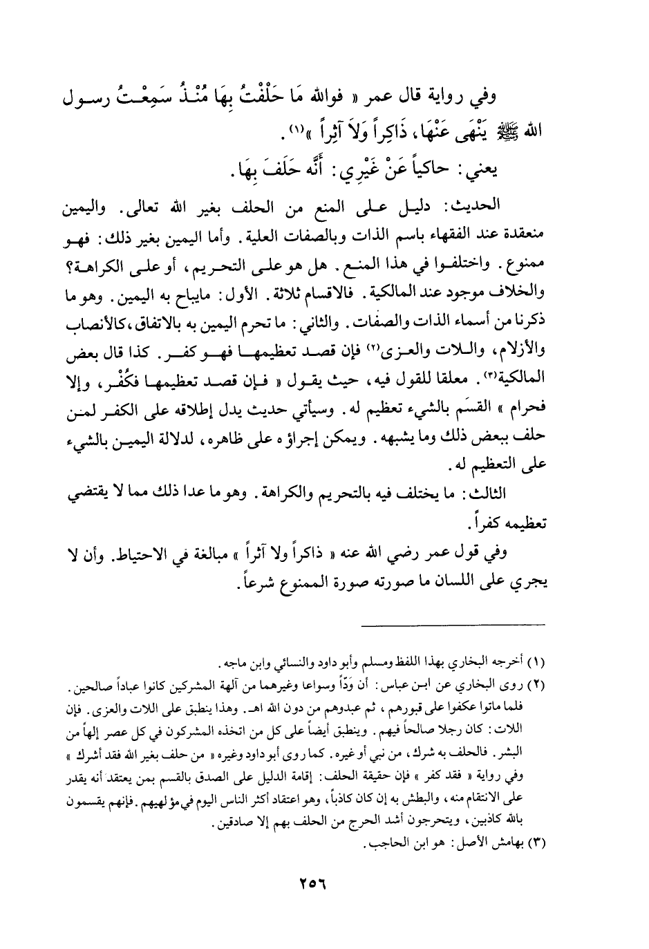 يَعْنِي: حَاكِيًا عَنْ غَيْرِي أَنَّهُ حَلَفَ بِهَا. الْحَدِيثُ دَلِيلٌ عَلَى الْمَنْعِ مِنْ الْحَلِفِ بِغَيْرِ اللَّهِ تَعَالَى وَالْيَمِينُ مُنْعَقِدَةٌ عِنْدَ الْفُقَهَاءِ بِاسْمِ الذَّاتِ وَبِالصِّفَاتِ الْعَلِيَّةِ، وَأَمَّا الْيَمِينُ بِغَيْرِ ذَلِكَ: فَهُوَ مَمْنُوعٌ، وَاخْتَلَفُوا فِي هَذَا الْمَنْعِ هَلْ هُوَ عَلَى التَّحْرِيمِ، أَوْ عَلَى الْكَرَاهَةِ؟ وَالْخِلَافُ مَوْجُودٌ عِنْدَ الْمَالِكِيَّةِ. فَالْأَقْسَامُ ثَلَاثَةٌ: الْأَوَّلُ: مَا يُبَاحُ بِهِ الْيَمِينُ وَهُوَ مَا ذَكَرْنَا مِنْ أَسْمَاءِ الذَّاتِ وَالصِّفَاتِ.