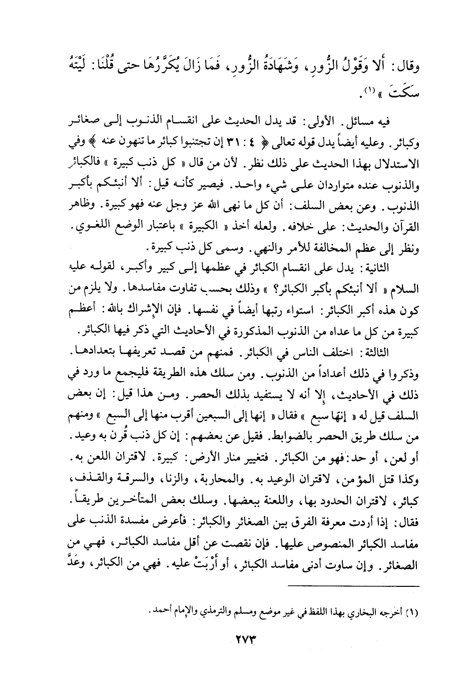 فِيهِ مَسَائِلُ: الْأُولَى: قَدْ يَدُلُّ الْحَدِيثُ عَلَى انْقِسَامِ الذُّنُوبِ إلَى صَغَائِرَ وَكَبَائِرَ وَعَلَيْهِ أَيْضًا يَدُلُّ قَوْله تَعَالَى {إِنْ تَجْتَنِبُوا كَبَائِرَ مَا تُنْهَوْنَ عَنْهُ} [النساء: 31] وَفِي الِاسْتِدْلَالِ بِهَذَا الْحَدِيثِ عَلَى ذَلِكَ نَظَرٌ؛ لِأَنَّ مَنْ قَالَ " كُلُّ ذَنْبٍ كَبِيرَةٌ " فَالْكَبَائِرُ وَالذُّنُوبُ عِنْدَهُ مُتَوَارِدَانِ عَلَى شَيْءٍ وَاحِدٍ فَيَصِيرُ كَأَنَّهُ قِيلَ: أَلَا أُنَبِّئُكُمْ بِأَكْبَرِ الذُّنُوبِ. وَعَنْ بَعْضِ السَّلَفِ: أَنَّ كُلَّ مَا نَهَى اللَّهُ عَزَّ وَجَلَّ عَنْهُ فَهُوَ كَبِيرَةٌ. وَظَاهِرُ الْقُرْآنِ وَالْحَدِيثِ: عَلَى خِلَافِهِ وَلَعَلَّهُ أَخَذَ " الْكَبِيرَة " بِاعْتِبَارِ الْوَضْعِ اللُّغَوِيِّ وَنَظَرَ إلَى عِظَمِ الْمُخَالَفَةِ لِلْأَمْرِ وَالنَّهْيِ وَسَمَّى كُلَّ ذَنْبٍ كَبِيرَةً.