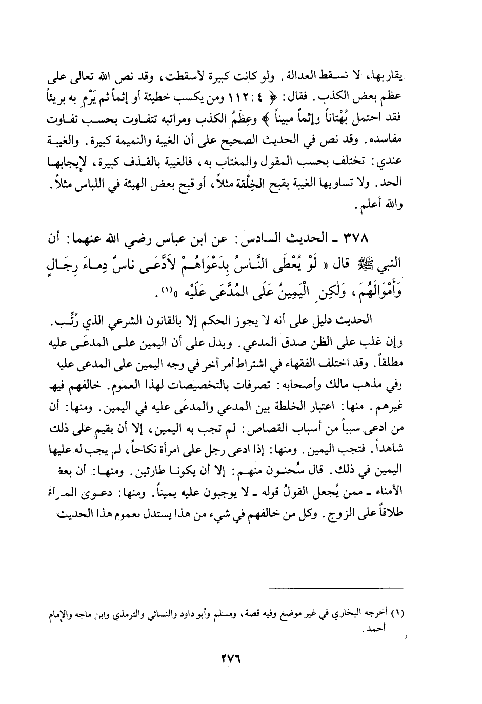 378 - الْحَدِيثُ السَّادِسُ: عَنْ ابْنِ عَبَّاسٍ - رَضِيَ اللَّهُ عَنْهُمَا -: «أَنَّ النَّبِيَّ - صَلَّى اللَّهُ عَلَيْهِ وَسَلَّمَ - قَالَ لَوْ يُعْطَى النَّاسُ بِدَعْوَاهُمْ لَادَّعَى نَاسٌ دِمَاءَ رِجَالٍ وَأَمْوَالَهُمْ، وَلَكِنْ الْيَمِينُ عَلَى الْمُدَّعَى عَلَيْهِ» .