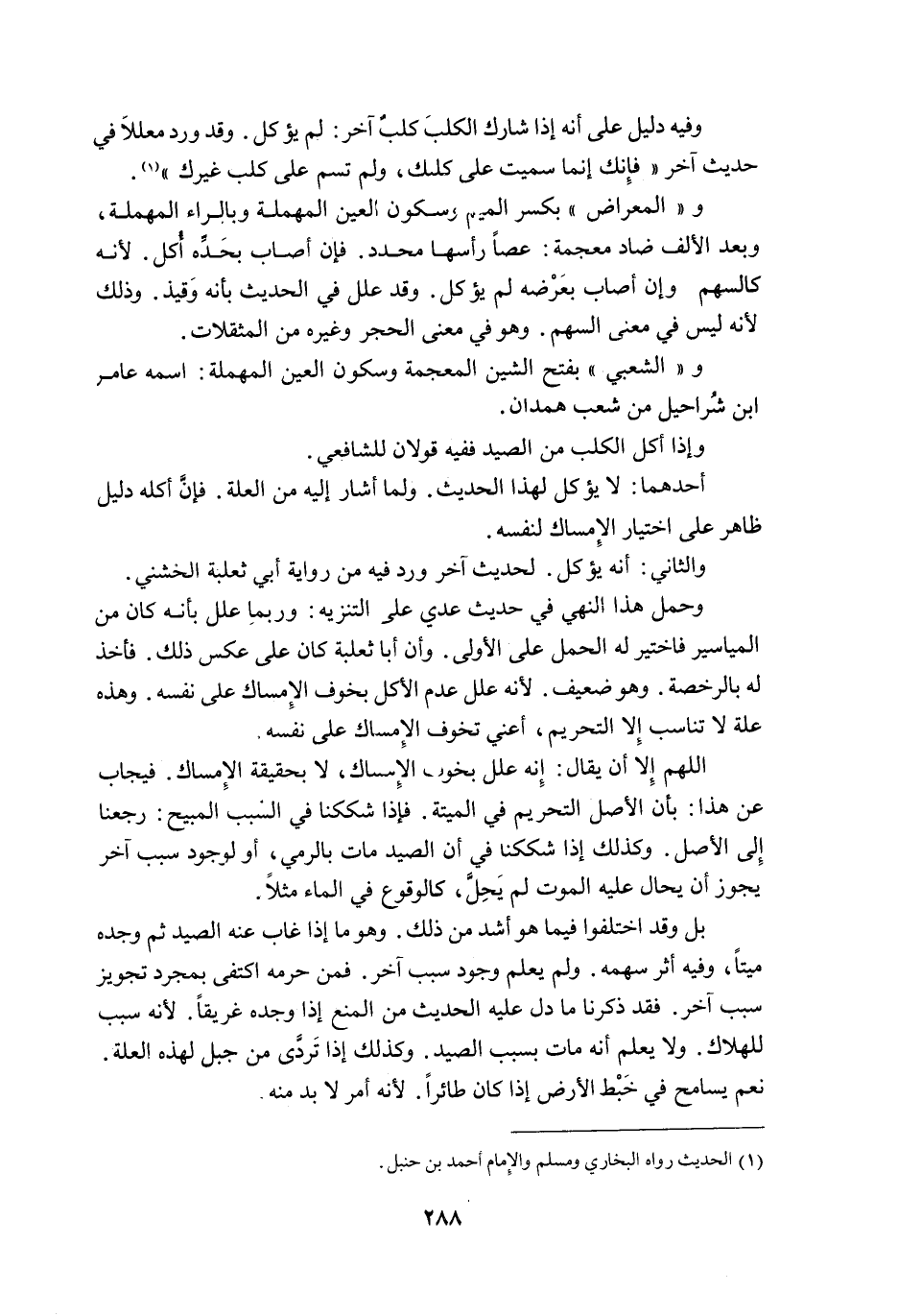وَ " الْمِعْرَاضُ " بِكَسْرِ الْمِيمِ وَسُكُونِ الْعَيْنِ الْمُهْمَلَةِ وَبِالرَّاءِ الْمُهْمَلَةِ، وَبَعْدَ الْأَلِفِ ضَادٌ مُعْجَمَةٌ: عَصًا رَأْسُهَا مُحَدَّدٌ، فَإِنْ أَصَابَ بِحَدِّهِ أُكِلَ؛ لِأَنَّهُ كَالسَّهْمِ، وَإِنْ أَصَابَ بِعَرْضِهِ لَمْ يُؤْكَلْ وَقَدْ عُلِّلَ فِي الْحَدِيثِ بِأَنَّهُ وَقِيذٌ وَذَلِكَ لِأَنَّهُ لَيْسَ فِي مَعْنَى السَّهْمِ وَهُوَ فِي مَعْنَى الْحَجَرِ وَغَيْرِهِ مِنْ الْمُثْقَلَاتِ. وَ " الشَّعْبِيُّ بِفَتْحِ الشِّينِ الْمُعْجَمَةِ وَسُكُونِ الْعَيْنِ الْمُهْمَلَةِ اسْمُهُ عَامِرُ بْنُ عَامِرِ بْنِ شَرَاحِيلَ مِنْ شَعْبِ هَمْدَانَ.