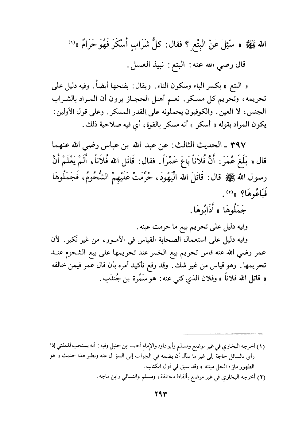 397 - الْحَدِيثُ الثَّالِثُ: عَنْ عَبْدِ اللَّهِ بْنِ عَبَّاسٍ - رَضِيَ اللَّهُ عَنْهُمَا - قَالَ «بَلَغَ عُمَرَ: أَنَّ فُلَانًا بَاعَ خَمْرًا فَقَالَ: قَاتَلَ اللَّهُ فُلَانًا، أَلَمْ يَعْلَمْ أَنَّ رَسُولَ اللَّهِ - صَلَّى اللَّهُ عَلَيْهِ وَسَلَّمَ - قَالَ: قَاتَلَ اللَّهُ الْيَهُودَ، حُرِّمَتْ عَلَيْهِمْ الشُّحُومُ، فَحَمَلُوهَا فَبَاعُوهَا؟» .