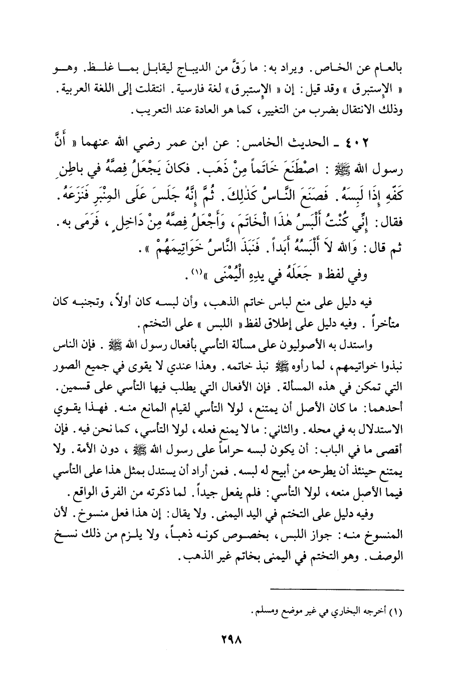 402 - الْحَدِيثُ الْخَامِسُ: عَنْ ابْنِ عُمَرَ - رَضِيَ اللَّهُ عَنْهُمَا - " أَنَّ رَسُولَ اللَّهِ - صَلَّى اللَّهُ عَلَيْهِ وَسَلَّمَ -: «اصْطَنَعَ خَاتَمًا مِنْ ذَهَبٍ فَكَانَ يَجْعَلُ فَصَّهُ فِي بَاطِنِ كَفِّهِ إذَا لَبِسَهُ فَصَنَعَ النَّاسُ كَذَلِكَ ثُمَّ إنَّهُ جَلَسَ عَلَى الْمِنْبَرِ فَنَزَعَهُ فَقَالَ: إنِّي كُنْتُ أَلْبَسُ هَذَا الْخَاتَمَ، وَأَجْعَلُ فَصَّهُ مِنْ دَاخِلٍ، فَرَمَى بِهِ ثُمَّ قَالَ: وَاَللَّهِ لَا أَلْبَسُهُ أَبَدًا فَنَبَذَ النَّاسُ خَوَاتِيمَهُمْ» ، وَفِي لَفْظٍ " جَعَلَهُ فِي يَدِهِ الْيُمْنَى ".
