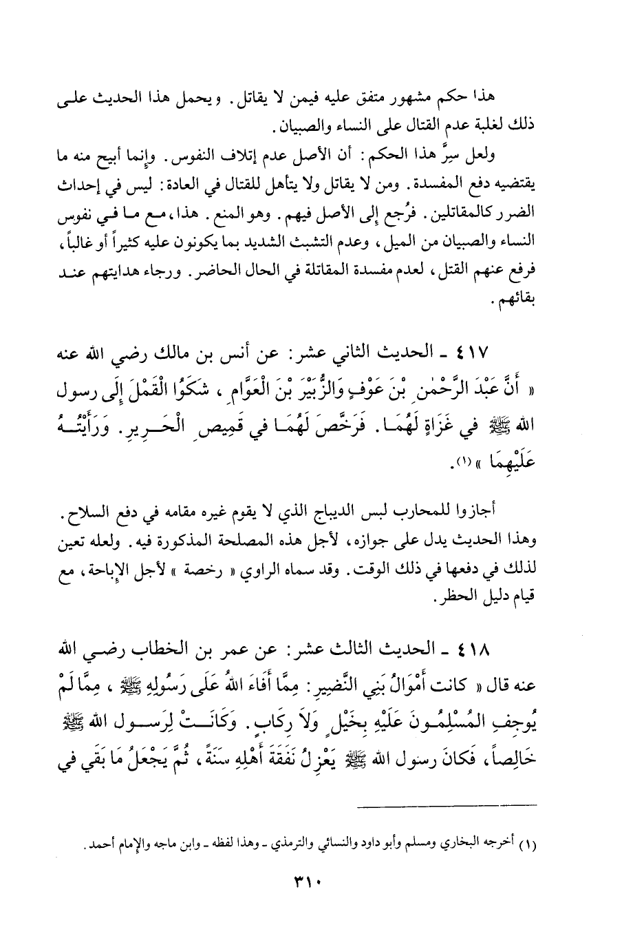 418 - الْحَدِيثُ الثَّالِثَ عَشَرَ: عَنْ عُمَرَ بْنِ الْخَطَّابِ - رَضِيَ اللَّهُ عَنْهُ - قَالَ «كَانَتْ أَمْوَالُ بَنِي النَّضِيرِ: مِمَّا أَفَاءَ اللَّهُ عَلَى رَسُولِهِ - صَلَّى اللَّهُ عَلَيْهِ وَسَلَّمَ - مِمَّا لَمْ يُوجِفْ الْمُسْلِمُونَ عَلَيْهِ بِخَيْلٍ وَلَا رِكَابٍ وَكَانَتْ لِرَسُولِ اللَّهِ - صَلَّى اللَّهُ عَلَيْهِ وَسَلَّمَ - خَالِصًا، فَكَانَ رَسُولُ اللَّهِ - صَلَّى اللَّهُ عَلَيْهِ وَسَلَّمَ - يَعْزِلُ نَفَقَةَ أَهْلِهِ سَنَةً، ثُمَّ يَجْعَلُ مَا بَقِيَ فِي