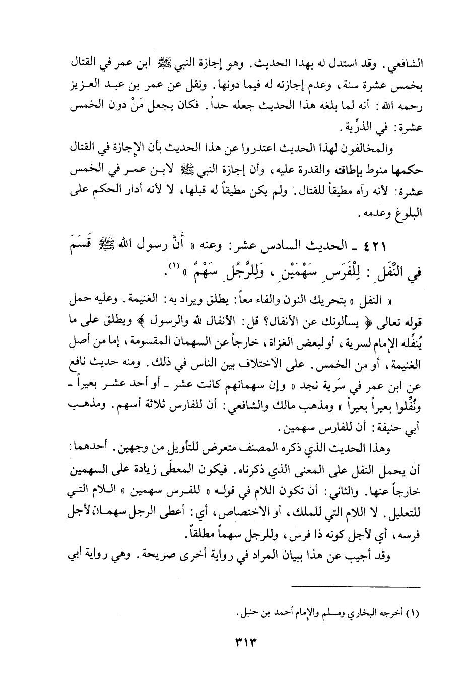 421 - الْحَدِيثُ السَّادِسَ عَشْرَ: وَعَنْهُ «أَنَّ رَسُولَ اللَّهِ - صَلَّى اللَّهُ عَلَيْهِ وَسَلَّمَ - قَسَمَ فِي النَّفَلِ: لِلْفَرَسِ سَهْمَيْنِ، وَلِلرَّجُلِ سَهْمًا» .