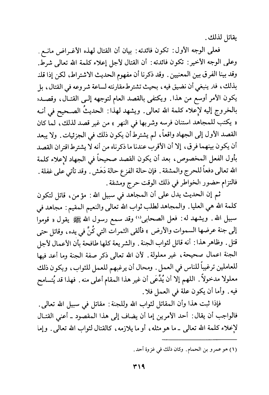 وَقَدْ تَأْتِي عَلَى غَفْلَةٍ فَالْتِزَامُ حُضُورِ الْخَوَاطِرِ فِي ذَلِكَ الْوَقْتِ حَرَجٌ وَمَشَقَّةٌ. ثُمَّ إنَّ الْحَدِيثَ يَدُلُّ عَلَى أَنَّ الْمُجَاهِدَ فِي سَبِيلِ اللَّهِ: مُؤْمِنٌ، قَاتَلَ لِتَكُونَ كَلِمَةُ اللَّهِ هِيَ الْعُلْيَا، وَالْمُجَاهِدُ لِطَلَبِ ثَوَابِ اللَّهِ تَعَالَى وَالنَّعِيمِ الْمُقِيمِ: مُجَاهِدٌ فِي سَبِيلِ اللَّهِ وَيَشْهَدُ لَهُ: فِعْلُ الصَّحَابِيِّ - وَقَدْ سَمِعَ رَسُولَ اللَّهِ - صَلَّى اللَّهُ عَلَيْهِ وَسَلَّمَ - يَقُولُ «قُومُوا إلَى جَنَّةٍ عَرْضُهَا السَّمَوَاتُ وَالْأَرْضُ» - فَأَلْقَى الثَّمَرَاتِ الَّتِي كُنَّ فِي يَدِهِ، وَقَاتَلَ حَتَّى قُتِلَ، وَظَاهِرُ هَذَا: أَنَّهُ قَاتَلَ لِثَوَابِ الْجَنَّةِ، وَالشَّرِيعَةُ كُلُّهَا طَافِحَةٌ بِأَنَّ الْأَعْمَالَ لِأَجْلِ الْجَنَّةِ أَعْمَالٌ صَحِيحَةٌ، غَيْرُ مَعْلُولَةٍ؛ لِأَنَّ اللَّهَ تَعَالَى ذَكَرَ صِفَةَ الْجَنَّةِ، وَمَا أَعُدْ فِيهَا لِلْعَامِلِينَ تَرْغِيبًا لِلنَّاسِ فِي الْعَمَلِ، وَمُحَالٌ أَنْ يُرَغِّبَهُمْ لِلْعَمَلِ لِلثَّوَابِ، وَيَكُونَ ذَلِكَ مَعْلُولًا مَدْخُولًا، اللَّهُمَّ إلَّا أَنْ يُدَّعَى أَنَّ غَيْرَ هَذَا الْمَقَامِ أَعْلَى مِنْهُ، فَهَذَا قَدْ يُتَسَامَحُ فِيهِ، وَأَمَّا أَنْ يَكُونَ عِلَّةً فِي الْعَمَلِ فَلَا. فَإِذَا ثَبَتَ هَذَا، وَأَنَّ الْمُقَاتِلَ لِثَوَابِ اللَّهِ، وَلِلْجَنَّةِ: مُقَاتِلٌ فِي سَبِيلِ اللَّهِ تَعَالَى فَالْوَاجِبُ أَنْ يُقَالَ: أَحَدُ الْأَمْرَيْنِ إمَّا أَنْ يُضَافَ إلَى هَذَا الْمَقْصُودِ - أَعْنِي الْقِتَالَ لِإِعْلَاءِ كَلِمَةِ اللَّهِ تَعَالَى - مَا هُوَ مِثْلُهُ، أَوْ مَا يُلَازِمُهُ، كَالْقِتَالِ لِثَوَابِ اللَّهِ تَعَالَى.