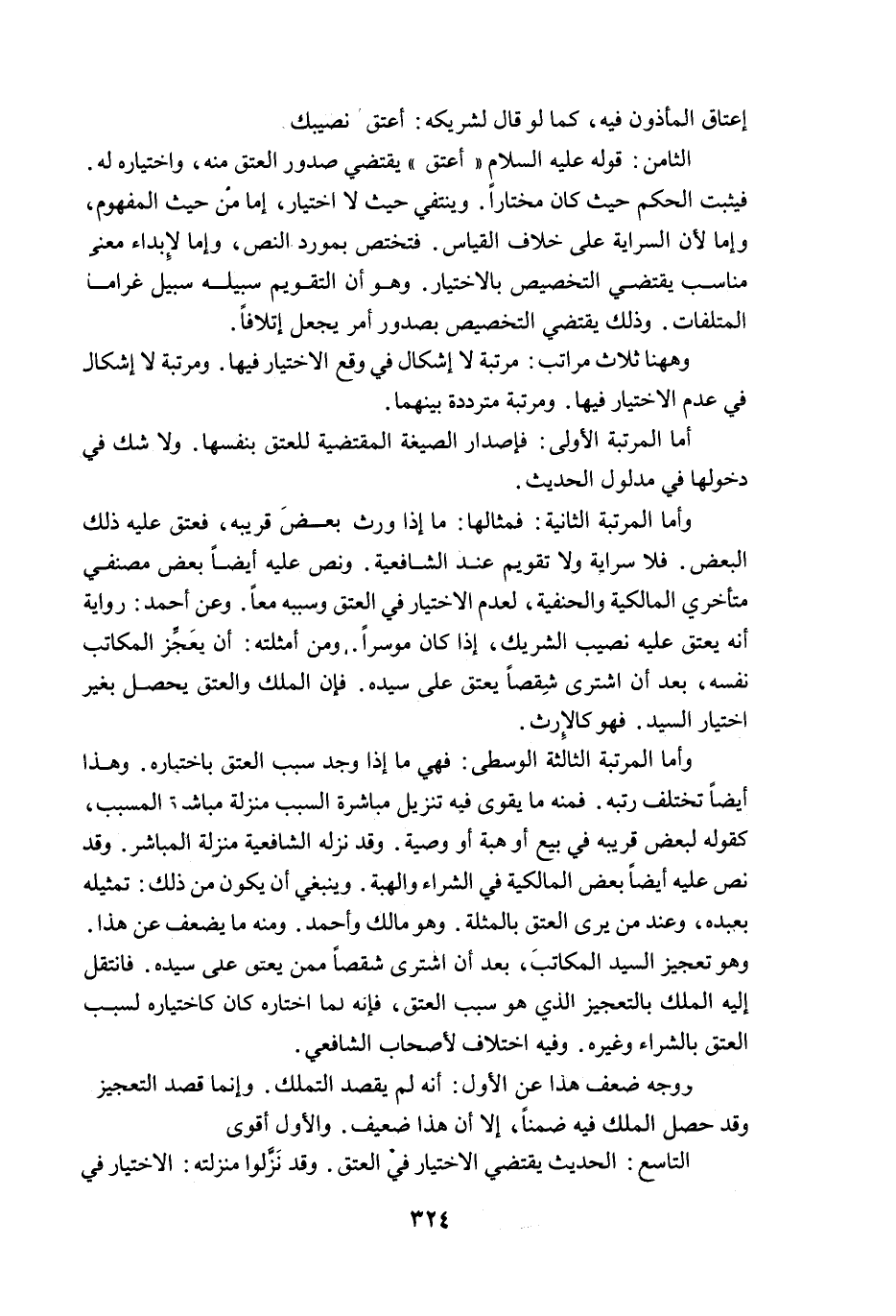 الثَّامِنُ: قَوْلُهُ - عَلَيْهِ السَّلَامُ - " أَعْتَقَ " يَقْتَضِي صُدُورَ الْعِتْقِ مِنْهُ، وَاخْتِيَارَهُ لَهُ فَيَثْبُتُ الْحُكْمُ حَيْثُ كَانَ مُخْتَارًا، وَيَنْتَفِي حَيْثُ لَا اخْتِيَارَ، إمَّا مِنْ حَيْثُ الْمَفْهُومِ، وَإِمَّا لِأَنَّ السِّرَايَةِ عَلَى خِلَافِ الْقِيَاسِ فَتَخْتَصُّ بِمَوْرِدِ النَّصِّ، وَإِمَّا لِإِبْدَاءِ مَعْنًى مُنَاسِبٍ يَقْتَضِي التَّخْصِيصَ بِالِاخْتِيَارِ، وَهُوَ أَنَّ التَّقْوِيمَ سَبِيلُهُ سَبِيلُ غَرَامَةِ الْمُتْلَفَاتِ، وَذَلِكَ يَقْتَضِي التَّخْصِيصَ بِصُدُورِ أَمْرٍ يُجْعَلُ إتْلَافًا، وَهَهُنَا ثَلَاثُ مَرَاتِبَ: مَرْتَبَةٌ لَا إشْكَالَ فِي وَقْعِ الِاخْتِيَارِ فِيهَا، وَمَرْتَبَةٌ لَا إشْكَالَ فِي عَدَمِ الِاخْتِيَارِ فِيهَا، وَمَرْتَبَةٌ مُتَرَدِّدَةٌ بَيْنَهُمَا. أَمَّا الْمَرْتَبَةُ الْأُولَى: فَإِصْدَارُ الصِّيغَةِ الْمُقْتَضِيَةِ لِلْعِتْقِ بِنَفْسِهَا، وَلَا شَكَّ فِي دُخُولِهَا فِي مَدْلُولِ الْحَدِيثِ. وَأَمَّا الْمَرْتَبَةُ الثَّانِيَةُ: فَمِثَالُهَا: مَا إذَا وَرِثَ بَعْضَ قَرِيبِهِ، فَعَتَقَ عَلَيْهِ ذَلِكَ الْبَعْضُ فَلَا سِرَايَةَ، وَلَا تَقْوِيمَ عِنْدَ الشَّافِعِيَّةِ، وَنَصَّ عَلَيْهِ أَيْضًا بَعْضُ مُصَنَّفِي مُتَأَخِّرِي الْمَالِكِيَّةِ وَالْحَنَفِيَّةِ، لِعَدَمِ الِاخْتِيَارِ فِي الْعِتْقِ وَسَبَبِهِ مَعًا، وَعَنْ أَحْمَدَ: رِوَايَةٌ أَنَّهُ يُعْتَقُ عَلَيْهِ نَصِيبُ الشَّرِيكِ، إذَا كَانَ مُوسِرًا، وَمَنْ أَمْثِلَتِهِ: أَنْ يَعْجَزَ الْمُكَاتَبُ نَفْسُهُ بَعْدَ أَنْ اشْتَرَى شِقْصًا يُعْتَقُ عَلَى سَيِّدِهِ فَإِنَّ الْمِلْكَ وَالْعِتْقَ يَحْصُلُ بِغَيْرِ اخْتِيَارِ السَّيِّدِ فَهُوَ كَالْإِرْثِ.