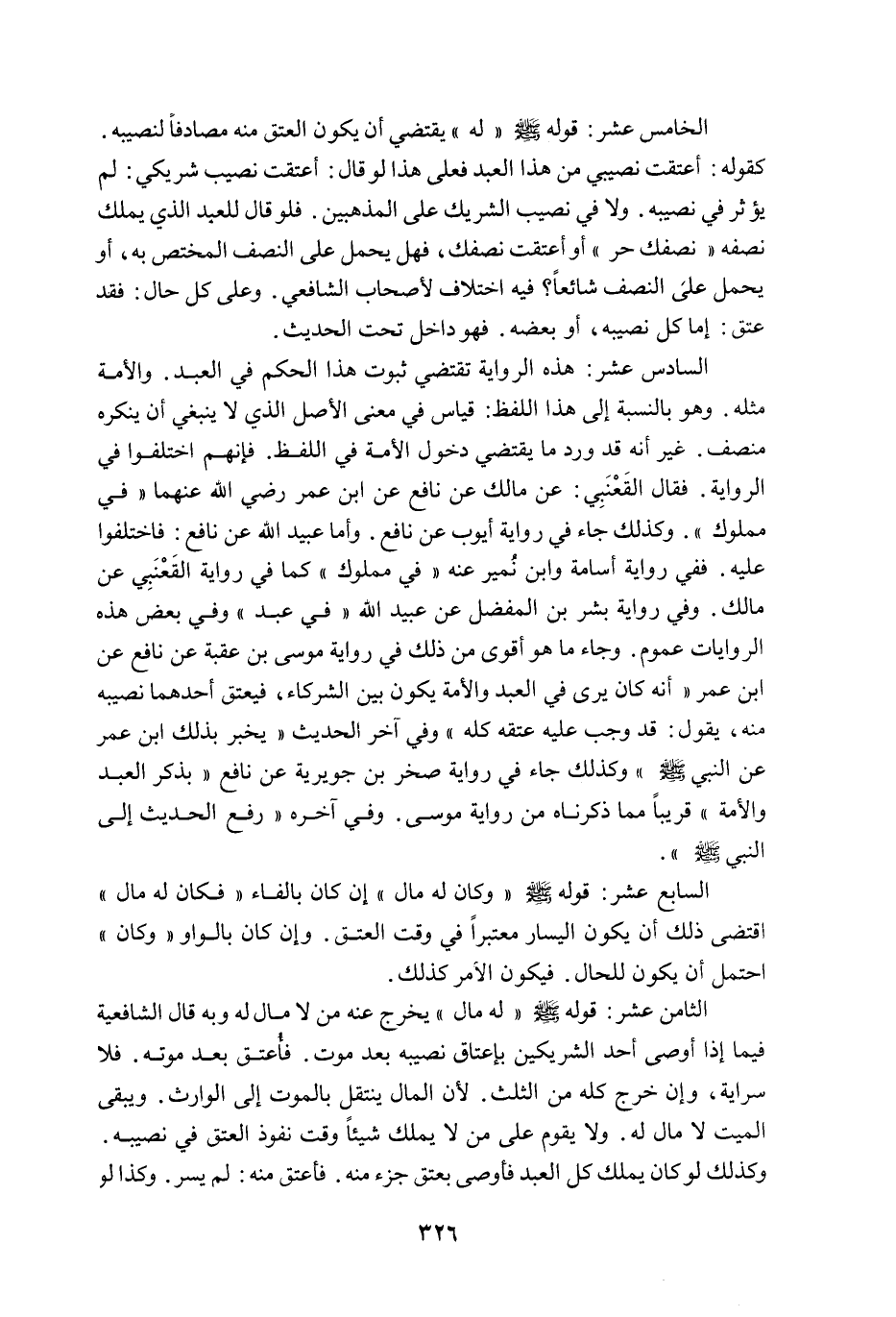 الثَّامِنَ عَشْرَ: قَوْلُهُ - صَلَّى اللَّهُ عَلَيْهِ وَسَلَّمَ - " لَهُ مَالٌ " يُخْرِجُ عَنْهُ مَنْ لَا مَالَ لَهُ، وَبِهِ قَالَ الشَّافِعِيَّةُ فِيمَا إذَا أَوْصَى أَحَدُ الشَّرِيكَيْنِ بِإِعْتَاقِ نَصِيبِهِ بَعْدَ مَوْتٍ فَأُعْتِقَ بَعْدَ مَوْتِهِ فَلَا سِرَايَةَ، وَإِنْ خَرَجَ كُلُّهُ مِنْ الثُّلُثِ؛ لِأَنَّ الْمَالَ يَنْتَقِلُ بِالْمَوْتِ إلَى الْوَارِثِ، وَيَبْقَى الْمَيِّتُ لَا مَالَ لَهُ وَلَا يُقَوَّمُ عَلَى مَنْ لَا يَمْلِكُ شَيْئًا وَقْتَ نُفُوذِ الْعِتْقِ فِي نَصِيبِهِ، وَكَذَلِكَ لَوْ كَانَ يَمْلِكُ كُلَّ الْعَبْدِ فَأَوْصَى بِعِتْقِ جُزْءٍ مِنْهُ فَأَعْتَقَ مِنْهُ: لَمْ يَسْرِ، وَكَذَا لَوْ