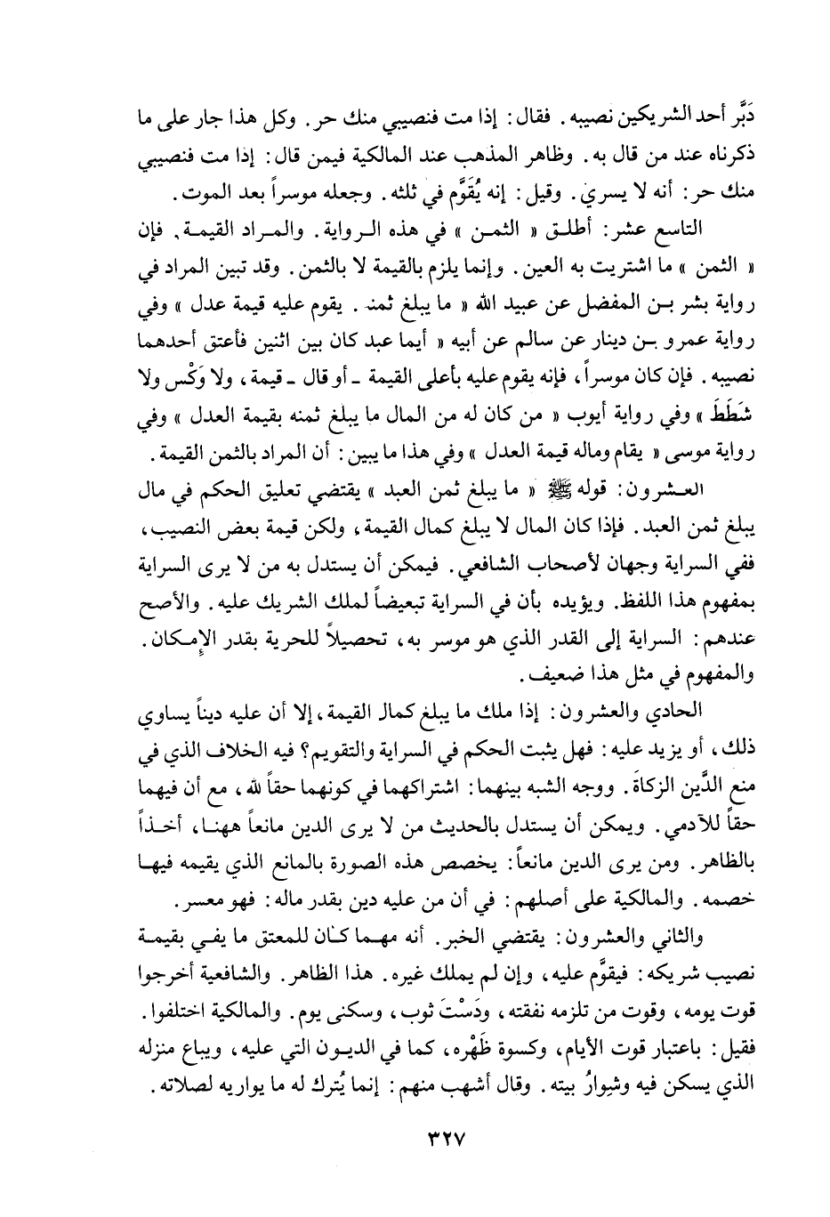 الْعِشْرُونَ: قَوْلُهُ - صَلَّى اللَّهُ عَلَيْهِ وَسَلَّمَ - " مَا يَبْلُغُ ثَمَنَ الْعَبْدِ " يَقْتَضِي تَعْلِيقَ الْحُكْمِ فِي مَالٍ يَبْلُغُ ثَمَنَ الْعَبْدِ فَإِذَا كَانَ الْمَالُ لَا يَبْلُغُ كَمَالَ الْقِيمَةِ وَلَكِنْ قِيمَةَ بَعْضِ النَّصِيبِ، فَفِي السِّرَايَةِ وَجْهَانِ لِأَصْحَابِ الشَّافِعِيِّ فَيُمْكِنُ أَنْ يَسْتَدِلَّ بِهِ مَنْ لَا يَرَى السِّرَايَةَ بِمَفْهُومِ هَذَا اللَّفْظِ، وَيُؤَيِّدُهُ بِأَنَّ فِي السِّرَايَةِ تَبْعِيضًا لِمِلْكِ الشَّرِيكِ عَلَيْهِ، وَالْأَصَحُّ عِنْدَهُمْ: السِّرَايَةُ إلَى الْقَدْرِ الَّذِي هُوَ مُوسِرٌ بِهِ، تَحْصِيلًا لِلْحُرِّيَّةِ بِقَدْرِ الْإِمْكَانِ، وَالْمَفْهُومُ فِي مِثْلِ هَذَا ضَعِيفٌ.