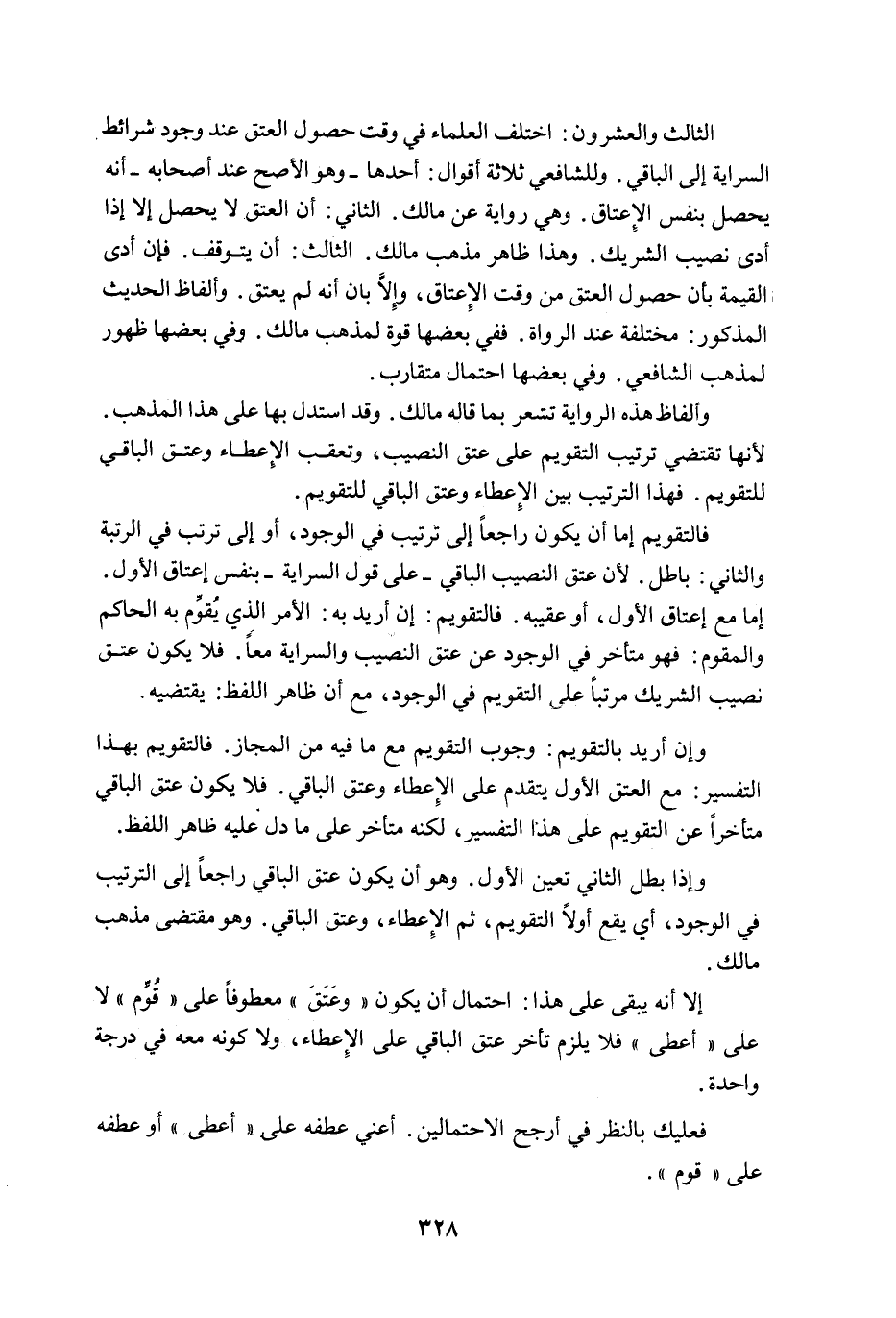 الثَّالِثُ وَالْعِشْرُونَ: اخْتَلَفَ الْعُلَمَاءُ فِي وَقْتِ حُصُولِ الْعِتْقِ عِنْدَ وُجُودِ شَرَائِطِ السِّرَايَةِ إلَى الْبَاقِي وَلِلشَّافِعِيِّ ثَلَاثَةُ أَقْوَالٍ: