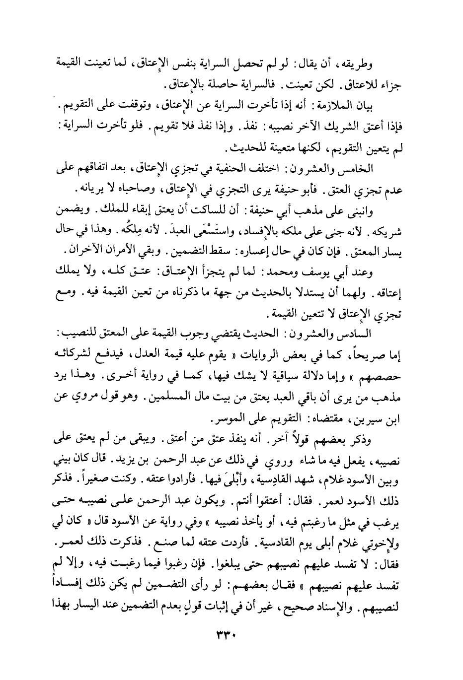 السَّادِسُ وَالْعِشْرُونَ: الْحَدِيثُ يَقْتَضِي وُجُوبَ الْقِيمَةِ عَلَى الْمُعْتِقِ لِلنَّصِيبِ: إمَّا صَرِيحًا، كَمَا فِي بَعْضِ الرِّوَايَاتِ " يُقَوَّمُ عَلَيْهِ قِيمَةَ الْعَدْلِ، فَيَدْفَعُ لِشُرَكَائِهِ حِصَصَهُمْ "، وَإِمَّا دَلَالَةً سِيَاقِيَّةً لَا يُشَكُّ فِيهَا، كَمَا فِي رِوَايَةٍ أُخْرَى، وَهَذَا يَرُدُّ مَذْهَبَ مَنْ يَرَى أَنَّ بَاقِيَ الْعَبْدِ يُعْتَقُ مِنْ بَيْتِ مَالِ الْمُسْلِمِينَ، وَهُوَ قَوْلٌ مَرْوِيٌّ عَنْ ابْنِ سِيرِينَ، مُقْتَضَاهُ: التَّقْوِيمُ عَلَى الْمُوسِرِ، وَذَكَرَ بَعْضُهُمْ قَوْلًا آخَرَ أَنَّهُ يَنْفُذُ عِتْقُ مَنْ أَعْتَقَ وَيَبْقَى مَنْ لَمْ يُعْتِقْ عَلَى نَصِيبِهِ، يَفْعَلُ فِيهِ مَا شَاءَ، وَرُوِيَ فِي ذَلِكَ عَنْ عَبْدِ الرَّحْمَنِ بْنِ يَزِيدَ قَالَ: كَانَ بَيْنِي وَبَيْنَ الْأَسْوَدِ غُلَامٌ، شَهِدَ الْقَادِسِيَّةَ، وَأَبْلَى فِيهَا فَأَرَادُوا عِتْقَهُ وَكُنْتُ صَغِيرًا فَذَكَرَ ذَلِكَ الْأَسْوَدُ لِعُمَرَ فَقَالَ: أَعْتِقُوا أَنْتُمْ وَيَكُونُ عَبْدُ الرَّحْمَنِ عَلَى نَصِيبِهِ حَتَّى يَرْغَبَ فِي مِثْلِ مَا رَغِبْتُمْ فِيهِ، أَوْ يَأْخُذَ نَصِيبَهُ "، وَفِي رِوَايَةٍ عَنْ الْأَسْوَدِ قَالَ " كَانَ لِي، وَلِإِخْوَتِي غُلَامٌ أَبْلَى يَوْمَ الْقَادِسِيَّةِ فَأَرَدْتُ عِتْقَهُ لِمَا صَنَعَ فَذَكَرْتُ ذَلِكَ لِعُمَرَ فَقَالَ: لَا تُفْسِدْ عَلَيْهِمْ نَصِيبَهُمْ حَتَّى يَبْلُغُوا. فَإِنْ رَغِبُوا فِيمَا رَغِبْتُ فِيهِ، وَإِلَّا لَمْ تُفْسِدْ عَلَيْهِمْ نَصِيبَهُمْ " فَقَالَ بَعْضُهُمْ: لَوْ رَأَى التَّضْمِينَ لَمْ يَكُنْ ذَلِكَ إفْسَادًا لِنَصِيبِهِمْ، وَالْإِسْنَادُ صَحِيحٌ، غَيْرَ أَنَّ فِي إثْبَاتِ قَوْلٍ بِعَدَمِ التَّضْمِينِ عِنْدَ الْيَسَارِ بِهَذَا