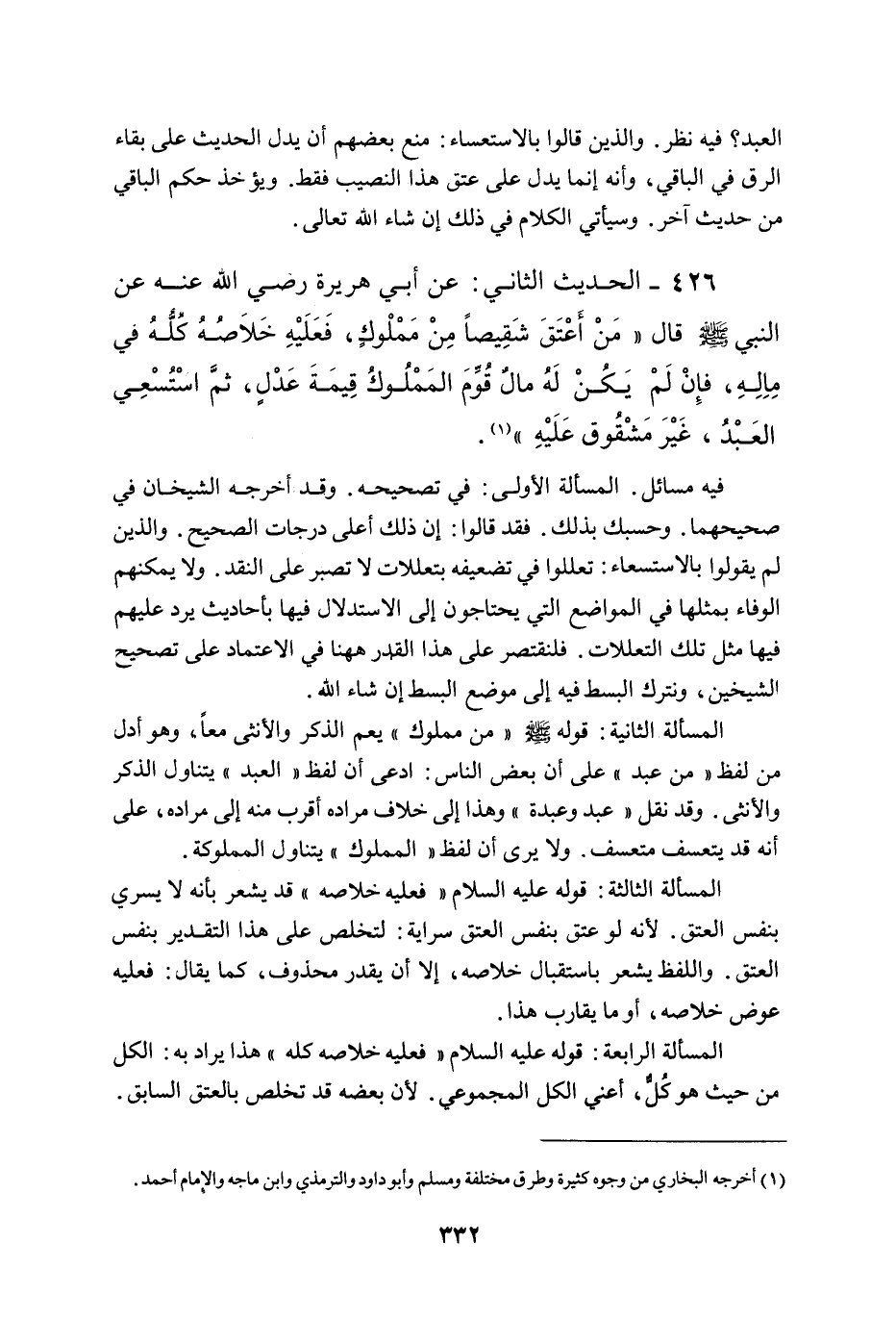 426 - الْحَدِيثُ الثَّانِي: عَنْ أَبِي هُرَيْرَةَ - رَضِيَ اللَّهُ عَنْهُ - عَنْ النَّبِيِّ - صَلَّى اللَّهُ عَلَيْهِ وَسَلَّمَ - قَالَ «مَنْ أَعْتَقَ شَقِيصًا مِنْ مَمْلُوكٍ، فَعَلَيْهِ خَلَاصُهُ كُلُّهُ فِي مَالِهِ، فَإِنْ لَمْ يَكُنْ لَهُ مَالٌ قُوِّمَ الْمَمْلُوكُ قِيمَةَ عَدْلٍ، ثُمَّ اُسْتُسْعِيَ الْعَبْدُ، غَيْرَ مَشْقُوقٍ عَلَيْهِ» .