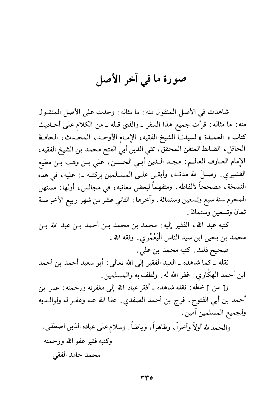 ـــــــــــــــــــــــــــــQصُورَةُ مَا فِي آخِرِ الْأَصْلِ شَاهَدْتُ فِي الْأَصْلِ الْمَنْقُولِ مِنْهُ: مَا مِثَالُهُ: وَجَدْتُ عَلَى الْأَصْلِ الْمَنْقُولِ مِنْهُ: مَا مِثَالُهُ: قَرَأْتُ جَمِيعَ هَذَا السِّفْرِ - وَاَلَّذِي قَبْلَهُ - مِنْ الْكَلَامِ عَلَى أَحَادِيثِ كِتَابِ " الْعُمْدَةِ " لِسَيِّدِنَا الشَّيْخِ الْفَقِيهِ، الْإِمَامِ الْأَوْحَدِ، الْمُحَدِّثِ، الْحَافِظِ الْحَافِلِ، الضَّابِطِ الْمُتْقِنِ الْمُحَقِّقِ، تَقِيِّ الدِّينِ أَبِي الْفَتْحِ مُحَمَّدِ بْنِ الشَّيْخِ الْفَقِيهِ الْإِمَامِ الْعَارِفِ الْعَالِمِ مَجْدِ الدِّينِ أَبِي الْحَسَنِ عَلِيِّ بْنِ وَهْبِ بْنِ مُطِيعٍ الْقُشَيْرِيِّ وَصَلَ اللَّهُ مُدَّتَهُ، وَأَبْقَى عَلَى الْمُسْلِمِينَ بَرَكَتَهُ -: عَلَيْهِ، فِي هَذِهِ النُّسْخَةِ، مُصَحِّحًا لِأَلْفَاظِهِ، وَمُتَفَهِّمًا لِبَعْضِ مَعَانِيهِ، فِي مَجَالِسَ، أَوَّلُهَا: مُسْتَهَلُّ الْمُحَرَّمِ سَنَةَ سَبْعٍ وَتِسْعِينَ وَسِتِّمِائَةٍ وَآخِرُهَا: الثَّانِيَ عَشَرَ مِنْ شَهْرِ رَبِيعٍ الْآخَرِ سَنَةَ ثَمَانٍ وَتِسْعِينَ وَسِتِّمِائَةٍ. كَتَبَهُ عَبْدُ اللَّهِ، الْفَقِيرُ إلَيْهِ: مُحَمَّدُ بْنُ مُحَمَّدِ بْنِ أَحْمَدَ بْنِ عَبْدِ اللَّهِ بْنِ مُحَمَّدِ بْنِ يَحْيَى بْنِ سَيِّدِ النَّاسِ الْيَعْمُرِيُّ وَفَقَّهَ اللَّهُ. صَحِيحٌ ذَلِكَ كَتَبَهُ مُحَمَّدُ بْنُ عَلِيٍّ. نَقَلَهُ - كَمَا شَاهَدَهُ - الْعَبْدُ الْفَقِيرُ إلَى اللَّهِ تَعَالَى: أَبُو سَعِيدٍ أَحْمَدُ بْنُ أَحْمَدَ بْنِ أَحْمَدَ الْهَكَّارِيُّ غَفَرَ اللَّهُ لَهُ، وَلَطَفَ بِهِ وَالْمُسْلِمِينَ. وَ [مِنْ] خَطِّهِ: نَقَلَهُ شَاهِدُهُ - أَفْقَرُ عِبَادِ اللَّهِ إلَى مَغْفِرَتِهِ وَرَحْمَتِهِ: عُمَرُ بْنُ أَحْمَدَ بْنِ أَبِي الْفُتُوحِ فَرَجُ بْنُ أَحْمَدَ الصَّفَدِيُّ عَفَا اللَّهُ عَنْهُ، وَغَفَرَ لَهُ وَلِوَالِدَيْهِ، وَلِجَمِيعِ الْمُسْلِمِينَ. آمِينَ.