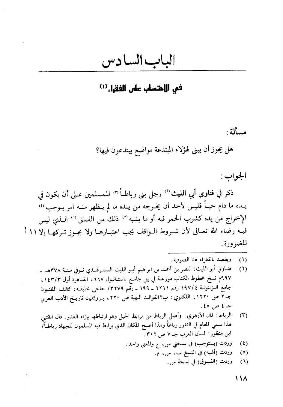 ذكر فِي قتاوى أبي اللَّيْث رجل بنى رِبَاطًا للْمُسلمين على أَن يكون فِي يَده مَا دَامَ حَيا فَلَيْسَ لأحد أَن يُخرجهُ من يَده مَا لم يظْهر مِنْهُ أَمر يُوجب الْإِخْرَاج من يَده كشرب الْخمر فِيهِ أَو مَا يشبه ذَلِك من الْفسق الَّذِي لَيْسَ فِيهِ رِضَاء الله تَعَالَى لِأَن شَرط الْوَاقِف يجب اعْتِبَارهَا وَلَا يجوز تَركهَا إِلَّا للضَّرُورَة