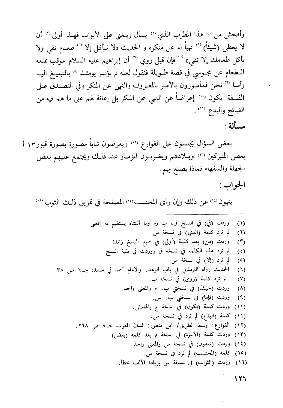 وأفحش من هَذَا المطرب الَّذِي يسْأَل ويتغنى على الْأَبْوَاب فَهَذَا أولى أَن لَا يعْطى شَيْئا نهيا لَهُ عَن منكره والْحَدِيث لَا تَأْكُل إِلَّا طَعَام تَقِيّ وَلَا يَأْكُل طَعَامك إِلَّا تَقِيّ فَإِن قيل رُوِيَ أَن إِبْرَاهِيم عَلَيْهِ السَّلَام عُوقِبَ بِمَنْعه الطَّعَام عَن مَجُوسِيّ فِي قصَّة طَوِيلَة فَنَقُول لَعَلَّه لم يُؤمر يَوْمئِذٍ بالتبلغ اليه وَأما نَحن فمأمورون بِالْأَمر بِالْمَعْرُوفِ وَالنَّهْي عَن الْمُنكر بل إِعَانَة لَهُم على مَا هم فِيهِ من القبائح والبدع