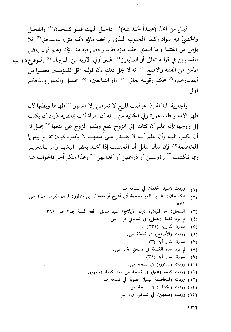 قيل من اتخذ عبدا لخدمته دَاخل الْبَيْت فَهُوَ كسحان والفحل والخصي فِيهِ سَواد وَكَذَا المحبوب الَّذِي لم يجِف مَاؤُهُ لِأَنَّهُ ينزل بالسحق فَلَا يُؤمن من الْفِتْنَة وَأما الَّذِي جف مَاؤُهُ فقد رخص فِيهِ مَشَايِخنَا وَهُوَ قَول بعض الْمُفَسّرين فِي قَوْله تَعَالَى أَو التَّابِعين غير أولي الأربة من الرِّجَال ولوقوع الْأَمْن من الْفِتْنَة وَالأَصَح انه لايحل ذَلِك لِأَن قَوْله قل للْمُؤْمِنين يغضوا من أَبْصَارهم مُحكم وَقَوله {أَو التَّابِعين} مُجمل وَالْعَمَل بالمحكم أولى