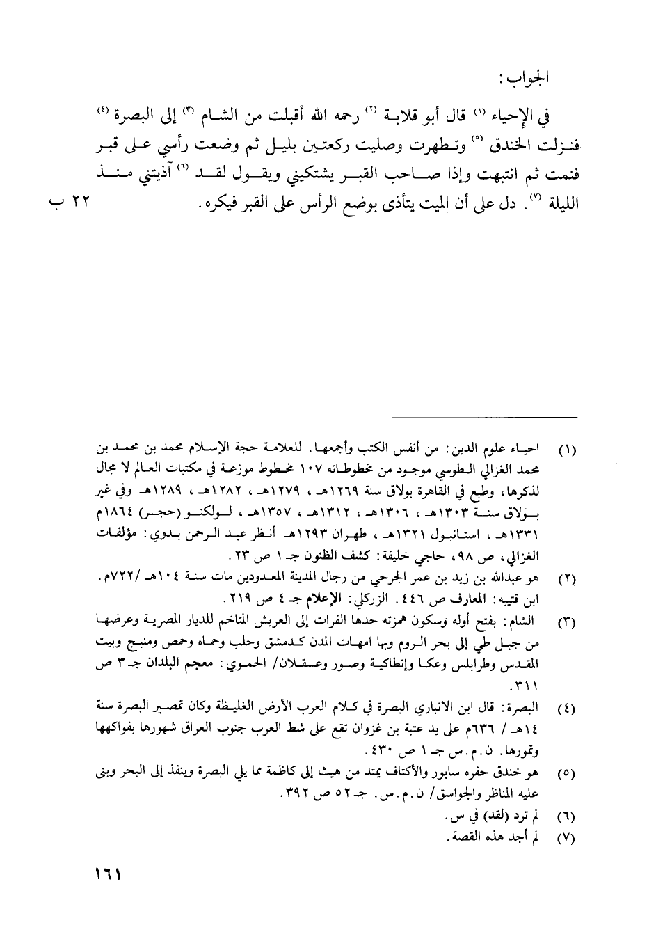 فِي الْإِحْيَاء قَالَ أَبُو قلَابَة رَحمَه الله أَقبلت من الشَّام إِلَى الْبَصْرَة فَنزلت الخَنْدَق وتطهرت وَصليت رَكْعَتَيْنِ بلَيْل ثمَّ وضعت رَأْسِي على قبر فَنمت ثمَّ انْتَبَهت وَإِذا صَاحب الْقَبْر يشتكيني وَيَقُول لقد آديتني مُنْذُ اللَّيْلَة دلّ على أَن على الْمَيِّت يتَأَذَّى بِوَضْع الرَّأْس على الْقَبْر فَيكْرَه