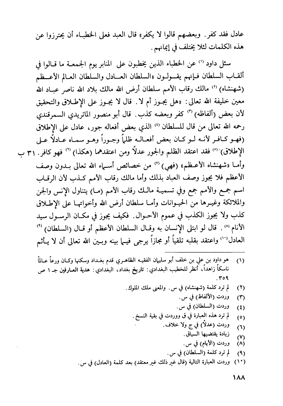 سُئِلَ دَاوُد عَن الخطباء الَّذين يخطبون على المنابر يَوْم الْجُمُعَة مَا قَالُوا فِي القاب السُّلْطَان فَإِنَّهُم يَقُولُونَ السُّلْطَان الْعَادِل وَالسُّلْطَان الْعَالم الْأَعْظَم شهنشاه مَالك رِقَاب الْأُمَم سُلْطَان أَرض الله مَالك بِلَاد الله نَاصِر عباد الله معِين خَليفَة الله تَعَالَى هَل يجوز أم لَا قَالَ لَا يجوز على الْإِطْلَاق وَالتَّحْقِيق لِأَن بعض الفاظه كفر وَبَعضه كذب قَالَ أَبُو مَنْصُور الماتريدي السَّمرقَنْدِي رَحمَه الله تَعَالَى من قَالَ للسُّلْطَان الَّذِي بعض أَفعاله جور عَادل على الْإِطْلَاق فَهُوَ كَافِر لِأَنَّهُ لَو كَانَ بعض أَفعاله ظلما وجورا وَهُوَ سَمَّاهُ عادلا على الْإِطْلَاق فقد اعْتقد الظُّلم والجور عدلا وَمن اعتقدهما هَكَذَا فَهُوَ كَافِر وَأما شهنشاه الْأَعْظَم فَهِيَ من خَصَائِص أَسمَاء الله تَعَالَى بِدُونِ وصف الْأَعْظَم فَلَا يجوز وصف الْعباد بذلك وَأما مَالك رِقَاب الْأُمَم كذب لِأَن الرّقاب اسْم جمع والأمم جمع وَفِي تَسْمِيَة مَالك رِقَاب الْأُمَم مَا يتَنَاوَل الْإِنْس وَالْجِنّ وَالْمَلَائِكَة وَغَيرهَا من الْحَيَوَانَات وَأما سُلْطَان أَرض الله وَأَخَوَاتهَا على الْإِطْلَاق كذب وَلَا يجوز الْكَذِب فِي عُمُوم الْأَحْوَال فَكيف يجوز فِي مَكَان الرَّسُول سيد الْأَنَام قَالَ لَو ابتلى الْإِنْسَان بِهِ وَقَالَ السُّلْطَان الْأَعْظَم أَو قَالَ السُّلْطَان الْعَادِل واعتقد بِقَلْبِه تلقيا أَو مجَازًا يُرْجَى فِيمَا بَينه وَبَين الله تَعَالَى أَن لَا يَأْثَم