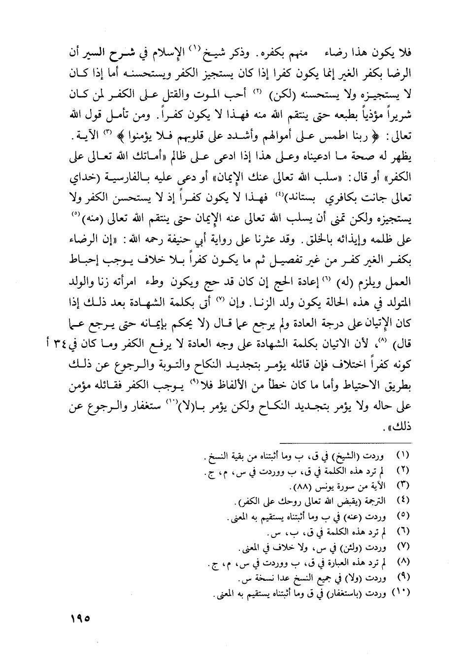 فَلَا يكون هَذَا رِضَاء مِنْهُم بِكُفْرِهِ وَذكر شيخ الْإِسْلَام فِي شرح السّير أَن الرِّضَا بِكفْر الْغَيْر إِنَّمَا يكون كفرا إِذا كَانَ يستجير الْكفْر ويستحسنه أما إِذا كَانَ لَا يستجيزه وَلَا يستحسنه لَكِن أحب الْمَوْت وَالْقَتْل على الْكفْر لمن كَانَ شريرا مؤذبا بطبعه حَتَّى ينْتَقم الله مِنْهُ فَهَذَا لَا يكون كفرا وَمن تَأمل قَول اله تَعَالَى {رَبنَا اطْمِسْ على أَمْوَالهم وَاشْدُدْ على قُلُوبهم فَلَا يُؤمنُوا} الْآيَة يظْهر لَهُ صِحَة مَا ادعيناه وعَلى هَذَا إِذا ادّعى على ظَالِم أماتك الله تَعَالَى على الْكفْر أَو قَالَ سلب الله تَعَالَى عَنْك الْإِيمَان أَو دعى عَلَيْهِ بِالْفَارِسِيَّةِ خداي تَعَالَى جانت بكافري بستاند فَهَذَا لَا يكون كفرا إِذْ لَا يستحسن الْكفْر وَلَا يستجيزه وَلَكِن تمنى أَن يسلب الله تَعَالَى عَنهُ الْإِيمَان حَتَّى ينْتَقم الله تَعَالَى مِنْهُ على ظلمه وإيذائه بالخلق وَقد عثرنا على رِوَايَة أبي حنيفَة رَحمَه الله إِن الرضاء بِكفْر الْغَيْر كفر من غير تَفْصِيل ثمَّ مَا يكون كفرا بِلَا خلاف يُوجب إحباط الْعَمَل وَيلْزم لَهُ إِعَادَة الْحَج إِن كَانَ قد حج وَيكون وَطْء امْرَأَته زنا وَالْولد الْمُتَوَلد فِي هَذِه الْحَالة يكون ولد الزِّنَا وَإِن أَتَى بِكَلِمَة الشَّهَادَة بعد ذَلِك إِذا كَانَ الْإِتْيَان على دَرَجَة الْعَادة وَلم يرجع عَمَّا قَالَ لَا يحكم بإيمانه حَتَّى يرجع عَمَّا قَالَ لِأَن الاتيان بِكَلِمَة الشَّهَادَة على وَجه الْعَادة لَا يرفع الْكفْر وَمَا كَانَ فِي كَونه كفرا اخْتِلَاف فَإِن قَائِله يُؤمر بتجديد النِّكَاح وَالتَّوْبَة وَالرُّجُوع عَن ذَلِك بطرِيق الِاحْتِيَاط وَأما مَا كَانَ خطأ من الْأَلْفَاظ فَلَا يُوجب الْكفْر فقائله مُؤمن على حَاله وَلَا يُؤمر بتجديد النِّكَاح وَلَكِن يُؤمر با لَا ستغفار وَالرُّجُوع عَن ذَلِك