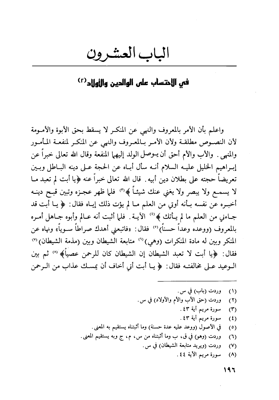 وَاعْلَم بِأَن الْأَمر بِالْمَعْرُوفِ وَالنَّهْي عَن الْمُنكر لَا يسْقط بِحَق الْأُبُوَّة والأمومة لِأَن النُّصُوص مُطلقَة وَلِأَن الْأَمر بِالْمَعْرُوفِ وَالنَّهْي عَن الْمُنكر لمَنْفَعَة الْمَأْمُور والمنهى وَالْأَب وَالأُم أَحَق أَن يُوصل الْوَلَد إِلَيْهِمَا الْمَنْفَعَة وَقَالَ الله تَعَالَى خَبرا عَن إِبْرَاهِيم الْخَلِيل عَلَيْهِ السَّلَام أَنه سَأَلَ أَبَاهُ عَن الْحجَّة على دينه الْبَاطِل وَبَين تعريضا حجَّته على بطلَان دين أَبِيه قَالَ الله تَعَالَى خَبرا عَنهُ {يَا أَبَت لم تعبد مَا لَا يسمع وَلَا يبصر وَلَا يُغني عَنْك شَيْئا} فَلَمَّا ظهر عجزة وَتبين قبح دينه أخبرهُ عَن نَفسه بِأَنَّهُ أُوتِيَ من الْعلم مَا لم يُؤْت ذَلِك إِيَّاه فَقَالَ يَا أَبَت قد جَاءَنِي من الْعلم مَا لم يأتك الْآيَة فَلَمَّا أثبت أَنه عَالم وَأَبوهُ جَاهِل أمره بِالْمَعْرُوفِ ووعده وَعدا حسنا فَقَالَ فاتبعني أهدك صراطا سويا وَنَهَاهُ عَن الْمُنكر وَبَين لَهُ مَادَّة الْمُنْكَرَات وَهِي مُتَابعَة الشَّيْطَان وَبَين مذمة الشَّيْطَان فَقَالَ {يَا أَبَت لَا تعبد الشَّيْطَان إِن الشَّيْطَان كَانَ للرحمن عصيا} ثمَّ بَين الْوَعيد على مُخَالفَته فَقَالَ يَا أَبَت أَنِّي أَخَاف أَن يمسك عَذَاب من الرَّحْمَن