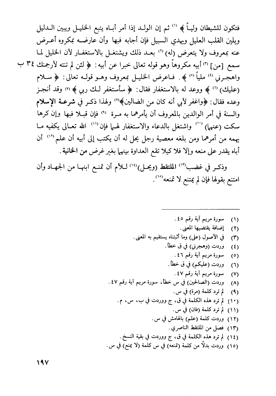 فَتكون للشَّيْطَان وليا) ثمَّ إِن الْوَلَد إِذا أَمر أَبَاهُ يتبع الْخَلِيل وَيبين الدَّلِيل ويلين الْقلب العليل وَيهْدِي السَّبِيل فَإِن أَجَابَهُ فبها وَإِن عَارضه بمكروه أعرض عَنهُ بِمَعْرُوف وَلَا يتَعَرَّض لَهُ بعد ذَلِك ويشتغل بالاستغفار لِأَن الْخَلِيل لما سمع من أَبِيه مَكْرُوها وَهُوَ قَوْله تَعَالَى خَبرا عَن أَبِيه {لَئِن لم تَنْتَهِ لأرجمنك واهجرني مَلِيًّا} فاعرض الْخَلِيل بِمَعْرُوف وَهُوَ قَوْله تَعَالَى {سَلام عَلَيْك} ووعد لَهُ بالاستغفار فَقَالَ {سأستغفر لَك رَبِّي} وَقد أنْجز وعده فَقَالَ {واغفر لأبي إِنَّه كَانَ من الضَّالّين} وَلِهَذَا ذكر فِي شرعة الْإِسْلَام وَالسّنة فِي أَمر الْوَالِدين بِالْمَعْرُوفِ أَن يأمرهما بِهِ مرّة فَإِن قبلا فبها وَإِن كرها سكت عَنْهُمَا واشتغل بِالدُّعَاءِ وَالِاسْتِغْفَار لَهما فَإِن الله تَعَالَى يكفية مَا يهمه من أَمرهمَا وَمن بلغه مَعْصِيّة رجل يحل لَهُ أَن يكْتب إِلَى أَبِيه أَن علم أَن أَبَاهُ يقدر على مَنعه وَإِلَّا فَلَا كَيْلا تقع الْعَدَاوَة بَينهمَا غَرَض من الْخَانِية