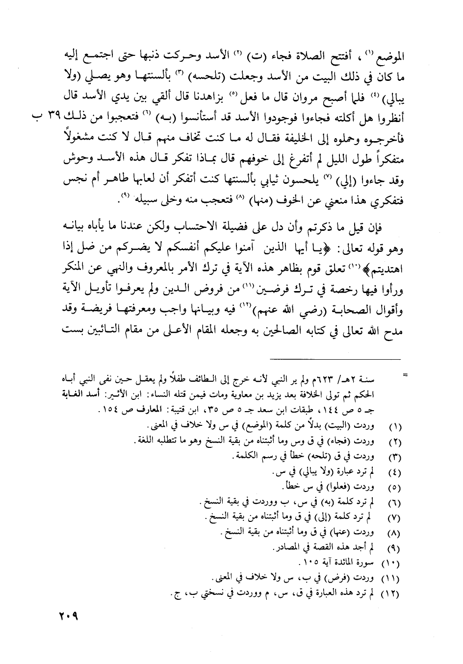 الْموضع أفْتَتح الصَّلَاة فجَاء ت الْأسد وحركت ذنبها حَتَّى اجْتمع إِلَيْهِ مَا كَانَ فِي ذَلِك الْبَيْت من الْأسد وَجعلت تلحسه بألسنتها وَهُوَ يُصَلِّي وَلَا يُبَالِي فَلَمَّا أصبح مَرْوَان قَالَ مَا فعل بزاهدنا قَالَ ألقِي بَين يَدي الْأسد قَالَ أنظروا هَل أَكلته فَجَاءُوا فوجودوا الْأسد قد أستأنسوا بِهِ فتعجبوا من ذَلِك فأخرجوه وَحَمَلُوهُ إِلَى الْخَلِيفَة فَقَالَ لَهُ مَا كنت تخَاف مِنْهُم قَالَ لَا كنت مَشْغُولًا متفكرا طول اللَّيْل لم أتفرغ إِلَى خوفهم قَالَ بِمَاذَا تفكر قَالَ هَذِه الْأسد وحوش وَقد جَاءُوا إِلَيّ يلحسون ثيانبي بألسنتها كنت أتفكر أَن لُعَابهَا طَاهِر أم نجس فتفكري هَذَا مَنَعَنِي عَن الْخَوْف مِنْهَا فتعجب مِنْهُ وخلى سَبيله