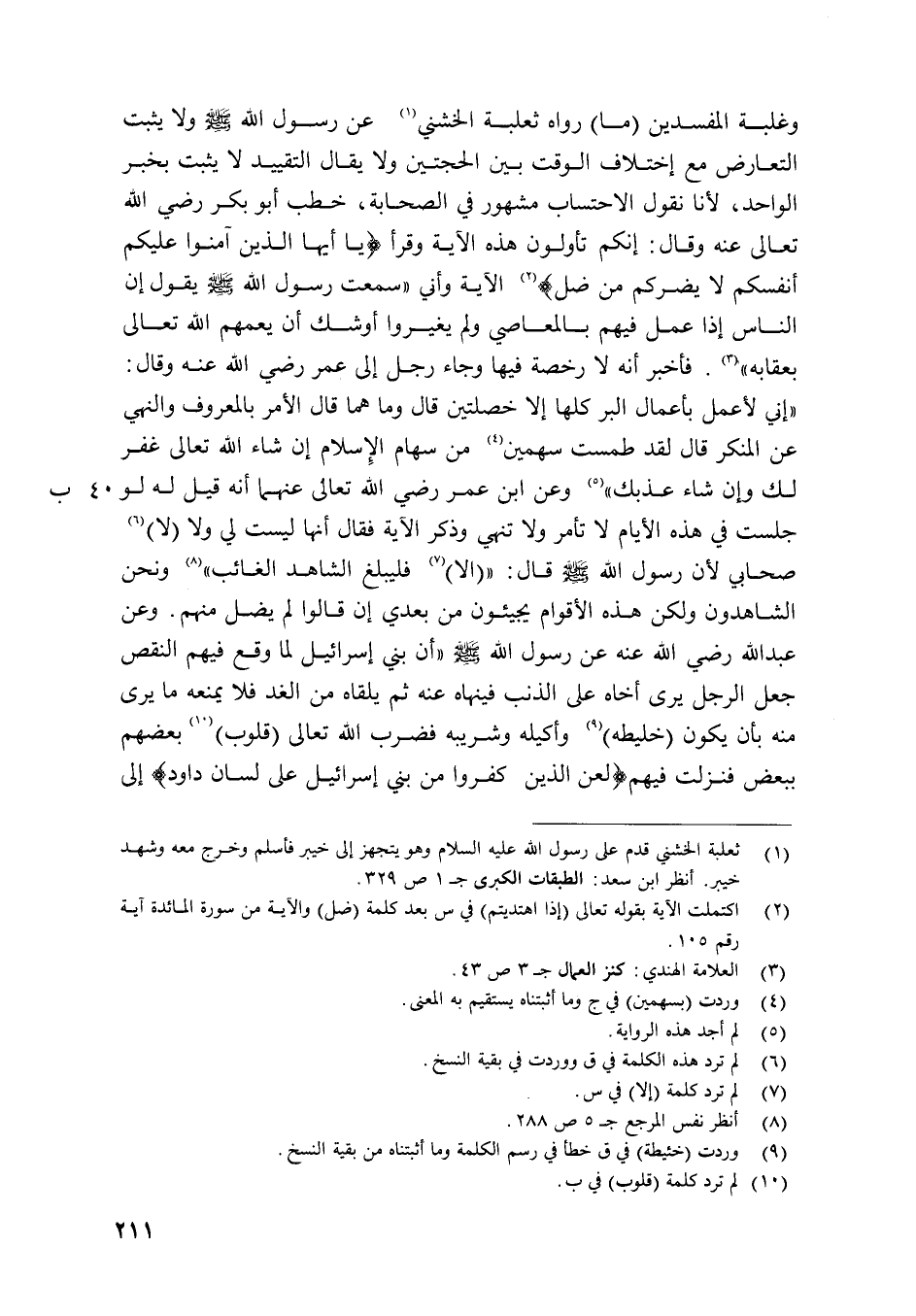 وَغَلَبَة المفسدين مَا رَوَاهُ ثَعْلَبَة الْخُشَنِي عَن رَسُول الله صلى الله عَلَيْهِ وَسلم وَلَا يثبت التَّعَارُض مَعَ إختلاف الْوَقْت بَين الحجتين وَلَا يُقَال التَّقْيِيد لَا يثبت بِخَبَر الْوَاحِد لأَنا نقُول الاحتساب مَشْهُور فِي الصَّحَابَة خطب أَبُو بكر رَضِي الله تَعَالَى عَنهُ وَقَالَ إِنَّكُم تأولون هَذِه الْآيَة وَقَرَأَ {يَا أَيهَا الَّذين آمنُوا عَلَيْكُم أَنفسكُم لَا يضركم من ضل} الْآيَة وَأَنِّي سَمِعت رَسُول الله صلى الله عَلَيْهِ وَسلم يَقُول إِن النَّاس إِذا عمل فيهم بِالْمَعَاصِي وَلم يُغيرُوا أوشك أَن يعمهم الله تَعَالَى بعقابه فَأخْبر أَنه لَا رخصَة فِيهَا وَجَاء رجل إِلَى عمر رَضِي الله عَنهُ وَقَالَ إِنِّي لأعمل بأعمال الْبر كلهَا إِلَّا خَصْلَتَيْنِ قَالَ وَمَا هما قَالَ الْأَمر بِالْمَعْرُوفِ وَالنَّهْي عَن الْمُنكر قَالَ لقد طمست سَهْمَيْنِ من سِهَام الْإِسْلَام إِن شَاءَ الله تَعَالَى غفر لَك وَإِن شَاءَ عذبك وَعَن عمر رَضِي الله تَعَالَى عَنْهُمَا أَنه قيل لَهُ لَو جَلَست فِي هَذِه الْأَيَّام لَا تَأمر وَلَا تنهي وَذكر الْآيَة فَقَالَ أها لَيست لي وَلَا لَا صَحَابِيّ لِأَن رَسُول الله صلى الله عَلَيْهِ وَسلم قَالَ الا فليبلغ الشَّاهِد الْغَائِب وَنحن الشاهدون وَلَكِن هَذِه الأقوام يجيئون من بعدِي إِن قَالُوا لم يضل مِنْهُم وَعَن عبد الله رَضِي الله عَنهُ عَن رَسُول الله صلى الله عَلَيْهِ وَسلم أَن بني إِسْرَائِيل لما وَقع فيهم النَّقْص جعل الرجل يرى أَخَاهُ يرى أَخَاهُ على الذَّنب فينهاه عَنهُ ثمَّ يلقاه من الْغَد فَلَا يمنعهُ مَا يرى مِنْهُ بِأَن يكون خليطه وأكيله وشريبه فَضرب الله تَعَالَى قُلُوب بَعضهم بِبَعْض فَنزلت فيهم {لعن الَّذين كفرُوا من بني إِسْرَائِيل على لِسَان دَاوُد} إِلَى