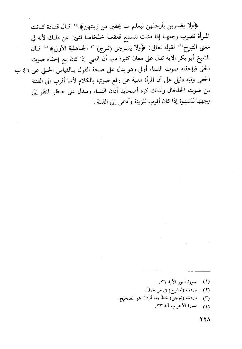 وَلَا يضربن بأرجلهن ليعلم مَا يخفين من زينتهن قَالَ قَتَادَة كَانَت الْمَرْأَة تضرب رجلهَا إِذا مشت لتسمع قعقعة خلْخَالهَا فنهين عَن ذَلِك لِأَنَّهُ فِي معنى التبرج لقَوْله تَعَالَى وَلَا يتبرجن تبرج الْجَاهِلِيَّة الأولى قَالَ الشَّيْخ أَبُو بكر الْآيَة تدل على معَان كَثِيرَة مِنْهَا أَن النَّهْي إِذا كَانَ مَعَ إخفاء صَوت الحلى فبإخفاء صَوت النِّسَاء أولى وَهُوَ يدل على صِحَة القَوْل بِالْقِيَاسِ الْحلِيّ على الْخَفي وَفِيه دَلِيل على أَن الْمَرْأَة منهية عَن رفع صَوتهَا بالْكلَام لِأَنَّهَا أقرب إِلَى الْفِتْنَة من صَوت الخلخال وَلذَلِك كره أَصْحَابنَا آذان النِّسَاء وَيدل على حظر النّظر إِلَى وَجههَا للشهوة إِذا كَانَ أقرب للزِّينَة وأدعى إِلَى الْفِتْنَة