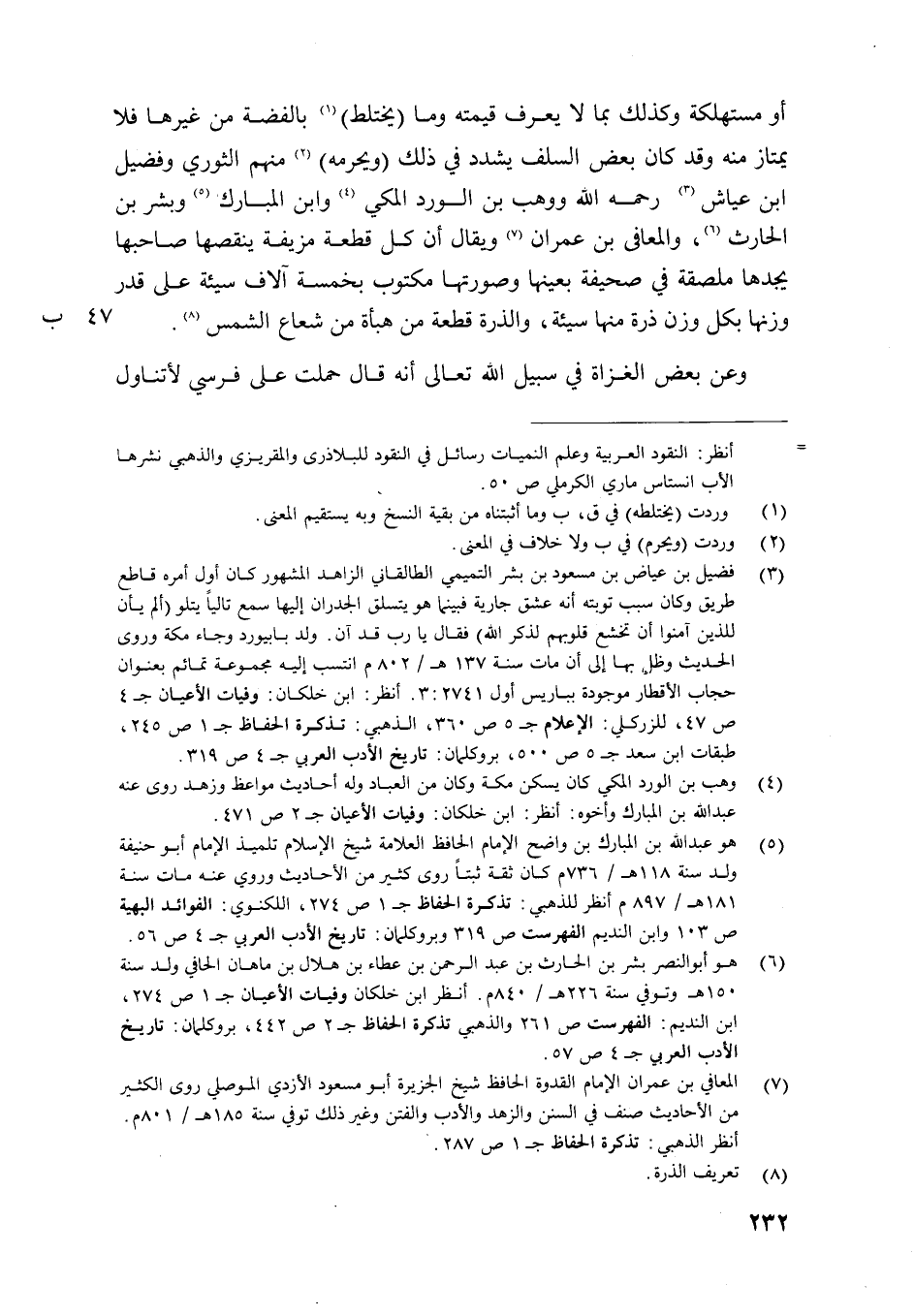 أَو مستهلكة وَكَذَلِكَ بِمَا لَا يعرف فيمته وَمَا يخْتَلط بِالْفِضَّةِ من غَيرهَا فَلَا يمتاز مِنْهُ وَقد كَانَ بعض السّلف يشدد فِي ذَلِك ويحرمه مِنْهُم الثَّوْريّ وفضيل ابْن عَيَّاش رَحمَه الله ووهب بن الْورْد الْمَكِّيّ وَابْن الْمُبَارك وَبشر بن الْحَارِث والمعافى بن عمرَان وَيُقَال أَن كل قِطْعَة مزيفة ينقصها صَاحبهَا يجدهَا ملصقة فِي صحيفَة بِعَينهَا وَصورتهَا مَكْتُوب بِخَمْسَة آلَاف سَيِّئَة على قدر وَزنهَا بِكُل وزن ذرة مِنْهَا سَيِّئَة والذرة قِطْعَة من هبأة من شُعَاع الشَّمْس