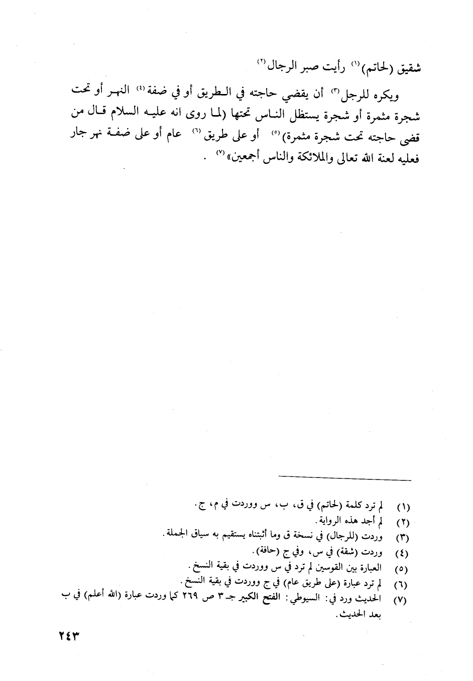 وَيكرهُ للرجل أَن يقْضِي حَاجته فِي الطَّرِيق أَو فِي ضفة النَّهر أَو تَحت شَجَرَة مثمرة أَو شَجَرَة يستظل النَّاس تحتهَا لما روى أَنه عَلَيْهِ السَّلَام قَالَ من قضى حَاجته تَحت شَجَرَة مثمرة أَو على طَرِيق عَام اَوْ على ضفة نهر جَار فَعَلَيهِ لعنة الله تَعَالَى وَالْمَلَائِكَة وَالنَّاس أَجْمَعِينَ
