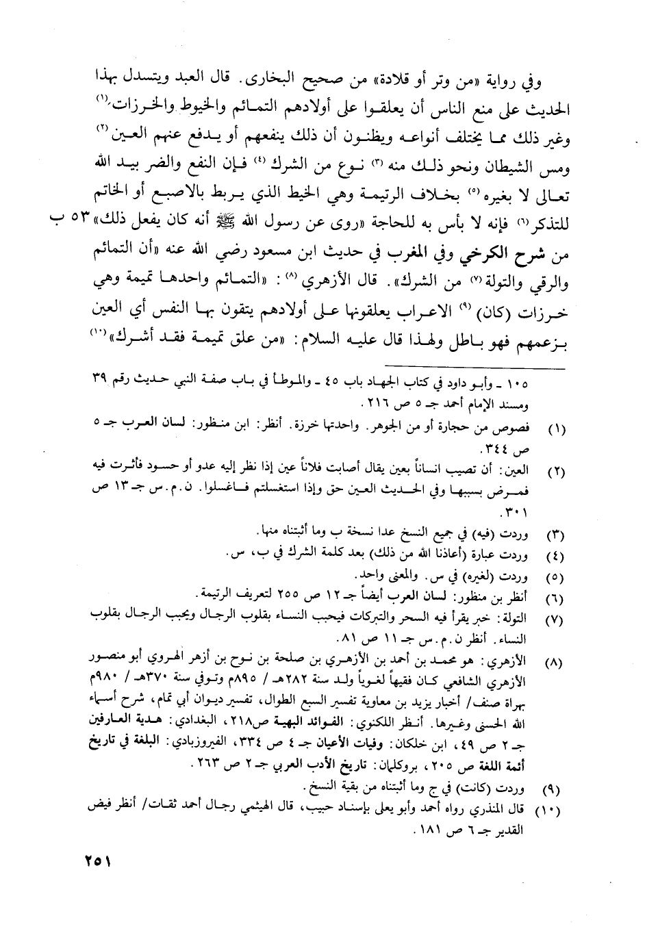 وَفِي رِوَايَة من وتر أَو قلادة من صَحِيح البُخَارِيّ قَالَ العَبْد ويتسدل بِهَذَا الحَدِيث على منع النَّاس أَن يعلقوا على أَوْلَادهم التمائم والخيوط والخرزات وَغير ذَلِك مِمَّا يخْتَلف أَنْوَاعه ويظنون أَن ذَلِك يَنْفَعهُمْ أَو يدْفع عَنْهُم الْعين وَمَسّ الشَّيْطَان وَنَحْو ذَلِك مِنْهُ نوع من الشّرك فَإِن النَّفْع والضر بيد الله تَعَالَى لَا بِغَيْرِهِ بِخِلَاف الرتيمة وَهِي الْخَيط الَّذِي يرْبط بالاصبع أَو الْخَاتم للتذكر فَإِنَّهُ لَا بَأْس بِهِ للْحَاجة روى عَن رَسُول الله صلى الله عَلَيْهِ وَسلم أَنه كَانَ يفعل ذَلِك من شرح الْكَرْخِي وَفِي الْمغرب فِي حَدِيث ابْن مَسْعُود رَضِي الله عَنهُ أَن التمائم والرقي والتولة من الشّرك قَالَ الْأَزْهَرِي التمائم وَاحِدهَا تَمِيمَة وَهِي خَرَزَات كَانَ الْأَعْرَاب يعلقونها على أَوْلَادهم يَتَّقُونَ بهَا النَّفس أَي الْعين يزعمهم فَهُوَ بَاطِل وَلِهَذَا قَالَ عَلَيْهِ السَّلَام من علق تَمِيمَة فقد أشرك