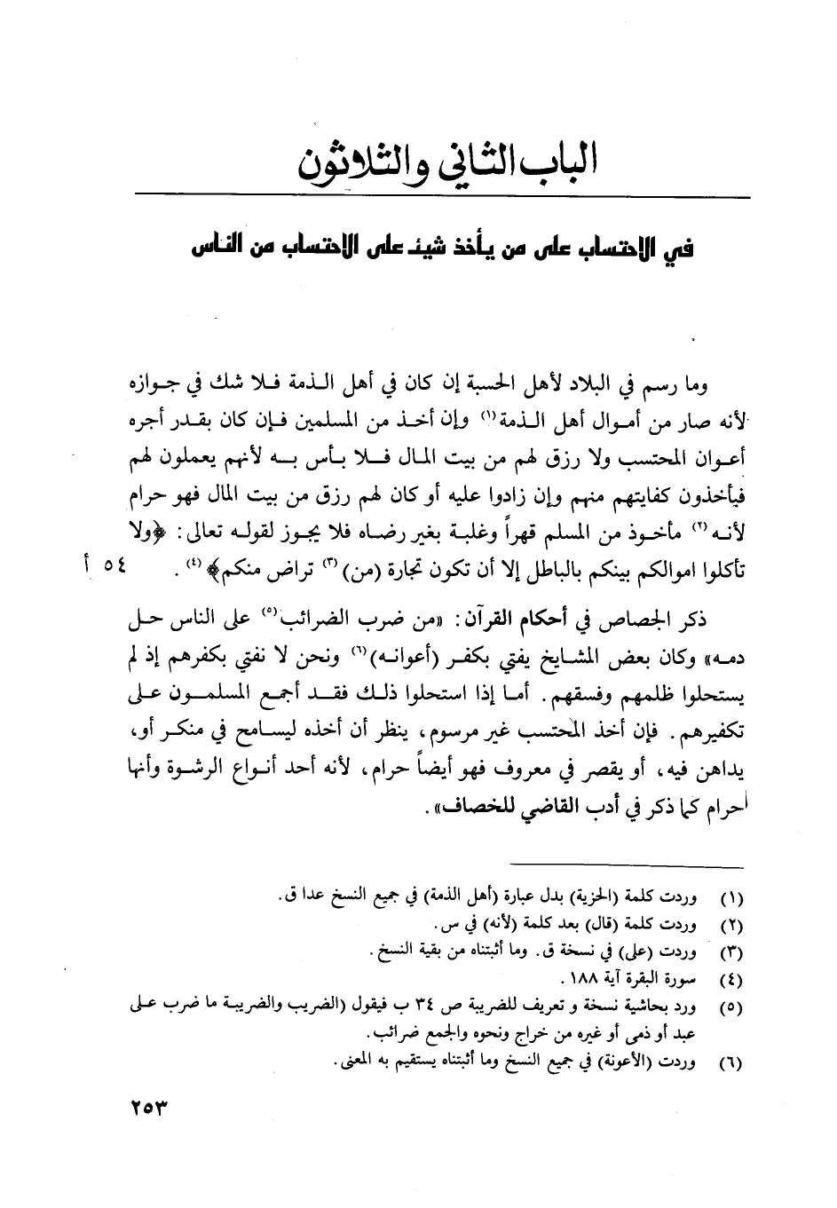 ذكرا جصاص فِي أَحْكَام الْقُرْآن من ضرب الضرائب على النَّاس حل دَمه وَكَانَ بعض الْمَشَايِخ يُفْتِي بِكفْر أعوانه وَنحن لَا نفتي بكفرهم إِذْ لم يستحلوا ظلمهم وفسقهم أما إِذا استحلوا ذَلِك فقد أجمع الْمُسلمُونَ على تكفيرهم فَإِن أَخذ الْمُحْتَسب غير مرسوم ينظر أَن أَخذه ليسامح فِي مُنكر أَو يداهن فِيهِ أَو يقصر فِي مَعْرُوف فَهُوَ أَيْضا حرَام لِأَنَّهُ أحد أَنْوَاع الرِّشْوَة وَأَنَّهَا حرَام كَمَا ذكر فِي أدب القَاضِي للخصاف