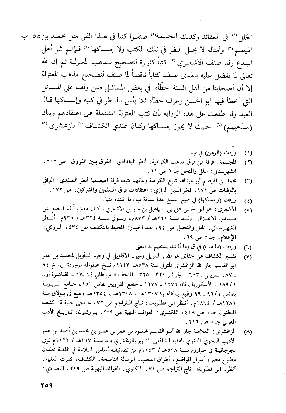 الْخلَل فِي العقائد وَكَذَلِكَ المجسمة صنفوا كتبا فِي هَذَا الْفَنّ مثل مُحَمَّد الهيصم وَأَمْثَاله لَا يحل النّظر فِي تِلْكَ الْكتب وَلَا إِِمْسَاكهَا فَإِنَّهُم شَرّ أهل الْبدع وَقد صنف الْأَشْعَرِيّ كتبا كَثِيرَة لتصحيح مَذْهَب الْمُعْتَزلَة ثمَّ إِن الله تَعَالَى لما تفضل عَلَيْهِ بِالْهدى صنف كتابا ناقضا لما صنف لتصحيح مَذْهَب الْمُعْتَزلَة إِلَّا أَن أَصْحَابنَا من أهل السّنة خطأه فِي بعض الْمسَائِل فَمن وقف على الْمسَائِل الَّتِي أَخطَأ فِيهَا أَبُو الْحسن وَعرف خطأه فَلَا بَأْس بِالنّظرِ فِي كتبه وإمساكها قَالَ العَبْد وَلما اطَّلَعت على هَذِه الرِّوَايَة بِأَن كتب الْمُعْتَزلَة الْمُشْتَملَة على اعْتِقَادهم وَبَيَان مَذْهَبهم الْخَبيث لَا يجوز إِِمْسَاكهَا وَكَانَ عِنْدِي الْكَشَّاف للزمخشري