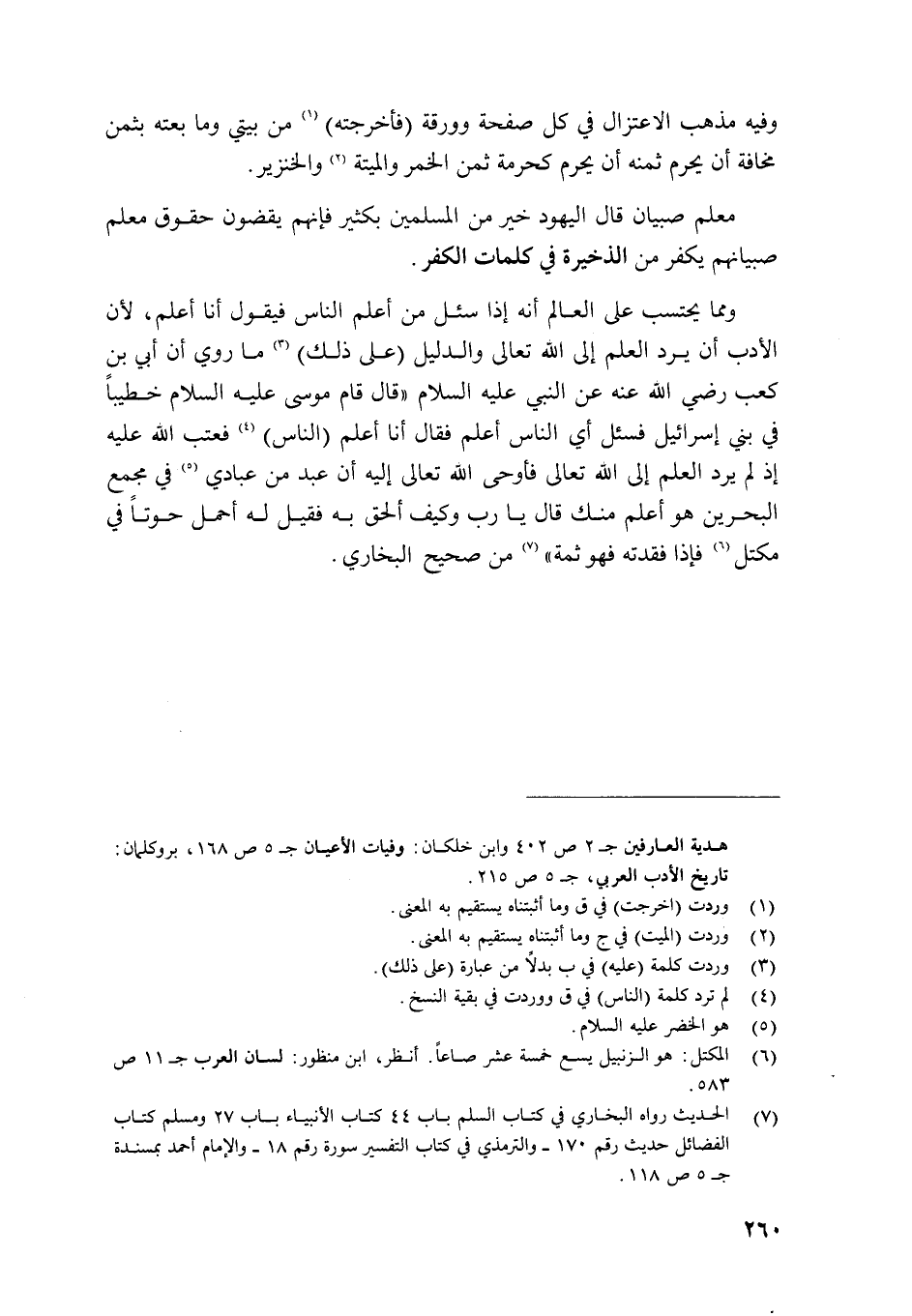 وَمِمَّا يحْتَسب على الْعَالم أَنه إِذا سُئِلَ من أعلم النَّاس فَيَقُول أَنا أعلم لِأَن الْأَدَب أَن يرد الْعلم إِلَى الله تَعَالَى وَالدَّلِيل على ذَلِك مَا رُوِيَ أَن أبي بن كَعْب رَضِي الله عَنهُ عَن النَّبِي عَلَيْهِ السَّلَام قَالَ قَامَ مُوسَى عَلَيْهِ السَّلَام خَطِيبًا فِي بني إِسْرَائِيل فَسئلَ أَي النَّاس أعلم فَقَالَ أَنا أعلم النَّاس فعتب الله عَلَيْهِ إِذْ لم يرد الْعلم إِلَى الله تَعَالَى فَأوحى الله تَعَالَى إِلَيْهِ أَن عبد من عبَادي فِي مجمع الْبَحْرين هُوَ أعلم مِنْك قَالَ يَا رب وَكَيف ألحق بِهِ فَقيل لَهُ أحمل حوتا فِي مكتل فَإِذا فقدته فَهُوَ ثمَّة من صَحِيح البُخَارِيّ