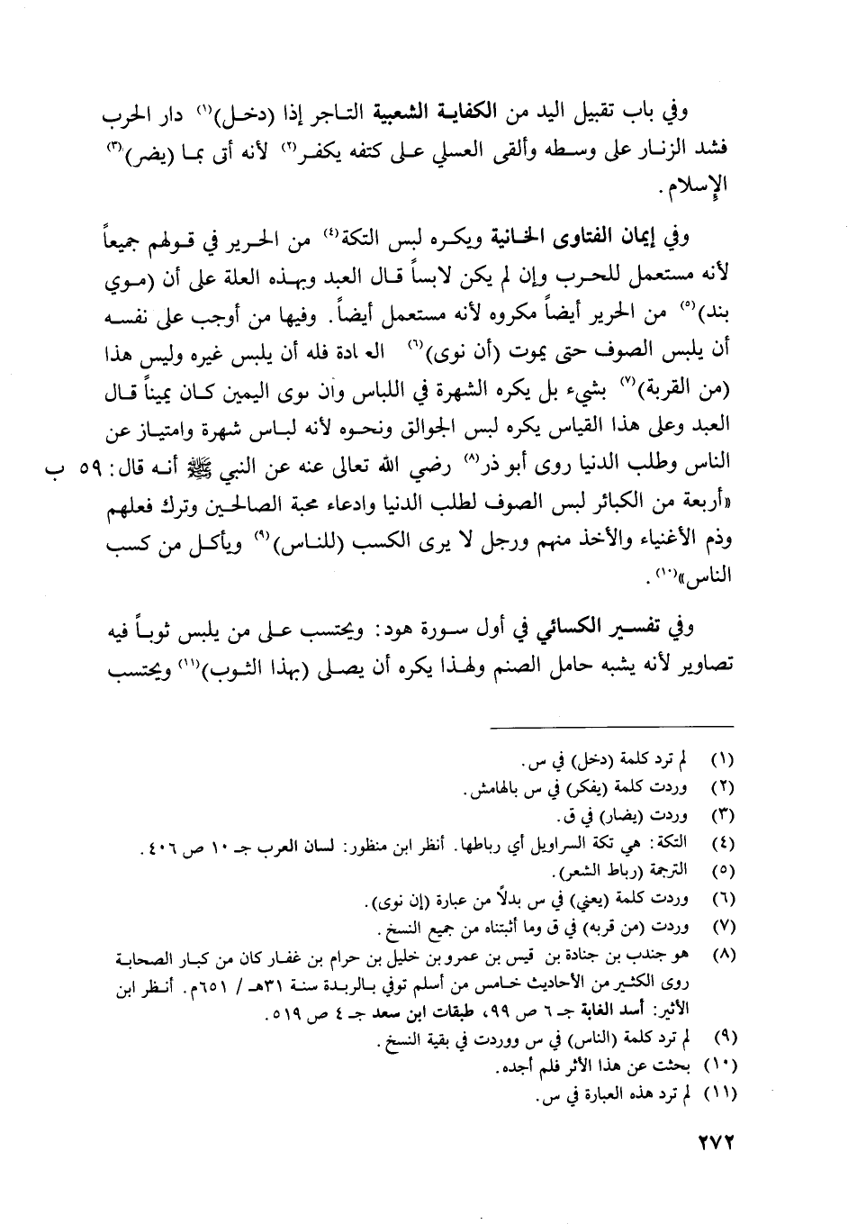 وَفِي تَفْسِير الْكسَائي فِي أول سُورَة هود ويحتسب على من يلبس ثوبا فِيهِ تصاوير لِأَنَّهُ يشبه حَامِل الصَّنَم وَلِهَذَا يكره أَن يصلى بِهَذَا الثَّوْب ويحتسب
