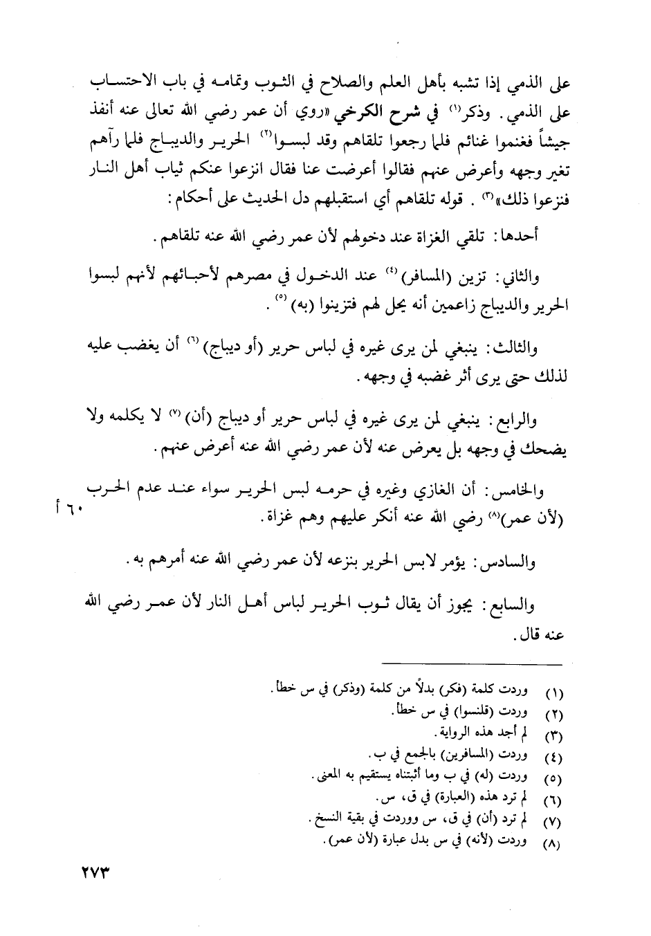 على الذِّمِّيّ إِذا تشبه بِأَهْل الْعلم وَالصَّلَاح فِي الثَّوْب وَتَمَامه فِي بَاب الاحتساب على الذِّمِّيّ وَذكر فِي شرح الْكَرْخِي رُوِيَ أَن عمر رَضِي الله تَعَالَى عَنهُ أنفذ جَيْشًا فعنموا عنائم فَلَمَّا رجعُوا تلقاهم وَقد لبسوا الْحَرِير والديباج فَلَمَّا رَآهُمْ تغير وَجهه وَأعْرض عَنْهُم فَقَالُوا أَعرَضت عَنَّا فَقَالَ انزعوا عَنْكُم ثِيَاب أهل النَّار فنزعوا ذَلِك قَوْله تلقاهم أَي اسْتَقْبَلَهُمْ دلّ الحَدِيث على أَحْكَام