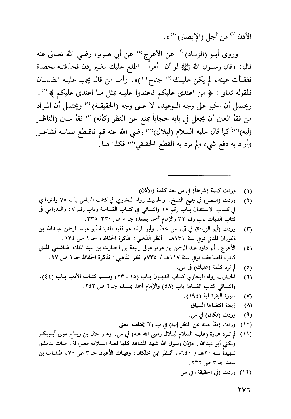 وروى أَبُو الزِّنَاد عَن الْأَعْرَج عَن أبي هُرَيْرَة رَضِي الله تَعَالَى عَنهُ قَالَ قَالَ رَسُول الله صلى الله عَلَيْهِ وَسلم لَو أَن أمرا اطلع عَلَيْك بِغَيْر إِذن فحذفته بحصاة ففقأت عينه لم يكن عَلَيْك جنَاح وَأما من قَالَ يجب عَلَيْهِ الضَّمَان فَلقَوْله تَعَالَى {من اعْتدى عَلَيْكُم فاعتدوا عَلَيْهِ بِمثل مَا اعْتدى عَلَيْكُم} وَيحْتَمل أَن الْخَبَر على وَجه الْوَعيد لَا على وَجه الْحَقِيقَة وَيحْتَمل أَن المُرَاد من فَقَأَ الْعين أَن يَجْعَل فِي بَابه حِجَابا يمْنَع عَن النّظر كَأَنَّهُ فَقَأَ عين النَّاظر إِلَيْهِ كَمَا قَالَ عَلَيْهِ السَّلَام لِبلَال رَضِي الله عَنهُ قُم فاقطع لِسَانه لشاعر وَأَرَادَ بِهِ دفع شَيْء وَلم يرد بِهِ الْقطع الْحَقِيقِيّ فَكَذَا هُنَا