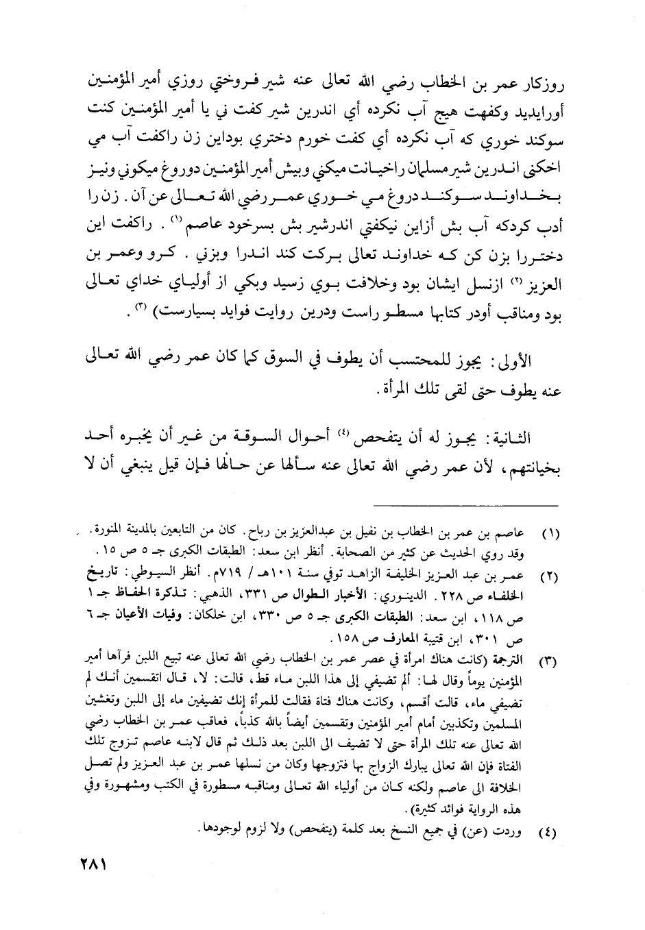 روزكار عمر بن الْخطاب رَضِي الله تَعَالَى عَنهُ شير فروختي روزي أَمِير الْمُؤمنِينَ أورايديد وكفهت هيج آب نكرده أَي اندرين شير كفت ني يَا أَمِير الْمُؤمنِينَ كنت سوكند خوري كه آب نكرده أَي كفت خورم دختري بوداين زن راكفت آب مي اخكنى اندرين شير مسلمان راخيانت ميكني وبيش أَمِير الْمُؤمنِينَ دوروغ ميكوني ونيز بخداوند سوكند دروغ مي خوري عمر رَضِي الله تَعَالَى عَن آن زن را أدب كردكه آب بش أزاين نيكفتي أندرشير بش بسرخود عَاصِم راكف ايْنَ دختررا بزن كن كه خداوند تَعَالَى بَركت كند اندرا وبزني كرو وَعمر بن الْعَزِيز ازنسل ايشان بود وخلافت بوي زسيد وبكي از أولياي خداي تَعَالَى بود ومناقت أودر كتابها مسطوراست ودرين روايت فوايد بسيارست