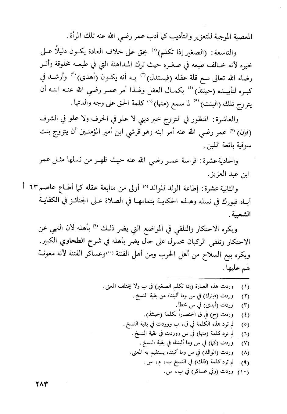 والتاسعة الصَّغِير إِذا تكلم يحِق على خلاف الْعَادة يكون دَلِيلا على خَيره لِأَنَّهُ خَالف طبعه فِي صغره حَيْثُ ترك المداهنة الَّتِي فِي طبعه مخلوقة وَأثر رِضَاء الله تَعَالَى مَعَ قلَّة عقله فيستدل بِهِ أَنه يكون أهْدى وأرشد فِي كبره لتأييده حِينَئِذٍ بِكَمَال الْعقل وَلِهَذَا أَمر عمر رَضِي الله عَنهُ ابْنه أَن يتَزَوَّج تِلْكَ الْبِنْت لما سمع مِنْهَا كلمة الْحق على وَجه والدتها