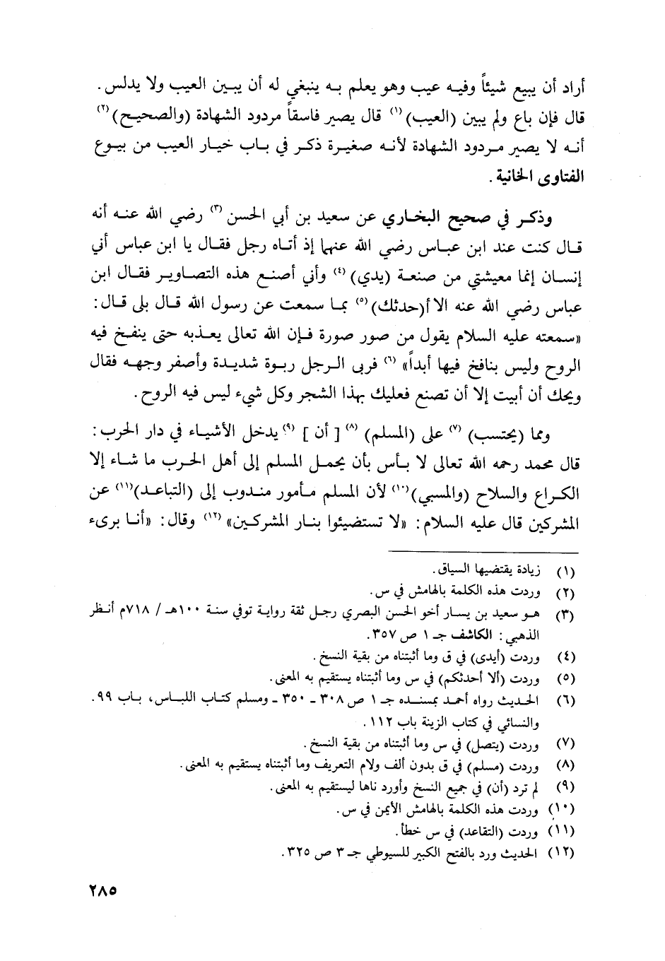 وَذكر فِي صَحِيح البُخَارِيّ عَن سعيد بن أبي الْحسن رَضِي الله عَنهُ أَنه قَالَ كنت عِنْد ابْن عَبَّاس رَضِي الله عَنْهُمَا إِذْ أَتَاهُ رجل فَقَالَ يَا ابْن عَبَّاس أَنِّي إِنْسَان إِنَّمَا معيشتي من صَنْعَة يَدي وَأَنِّي أصنع هَذِه التصاوير فَقَالَ ابْن عَبَّاس رَضِي الله عَنهُ الا أحَدثك بِمَا سَمِعت عَن رَسُول الله قَالَ بلَى قَالَ سمعته عَلَيْهِ السَّلَام يَقُول من صور صُورَة فَإِن الله تَعَالَى يعذبه حَتَّى ينْفخ فِيهِ الرّوح وَلَيْسَ بنافخ فِيهَا أبدا فربى الرجل ربوة شَدِيدَة وأصفر وَجهه فَقَالَ وَيحك أَن أَبيت إِلَّا أَن تصنع فَعَلَيْك بِهَذَا الشّجر وكل شَيْء لَيْسَ فِيهِ الرّوح