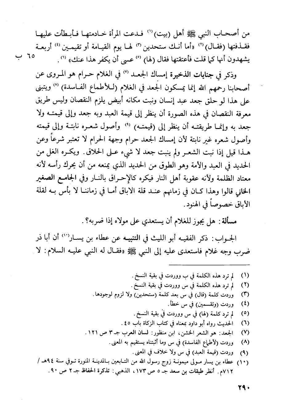 وَذكر فِي جنايات الذَّخِيرَة إمْسَاك الْجَعْد فِي الْغُلَام حرَام هُوَ المروى عَن أَصْحَابنَا رَحِمهم الله إِنَّمَا يمسكون الْجَعْد فِي الْغُلَام للأطماع الْفَاسِدَة ويتبنى على هَذَا لَو حلق جعد عبد إِنْسَان وَنبت مَكَانَهُ أَبيض يلْزم النُّقْصَان وَلَيْسَ طَرِيق معرفَة النُّقْصَان فِي هَذِه الصُّورَة أَن ينظر إِلَى قيمَة العَبْد وَبِه جعد وَإِلَى قِيمَته وَلَا جعد بِهِ وَإِنَّمَا طَرِيقَته أَن ينظر إِلَى قِيمَته وأصول شعره نابتة وَإِلَى قِيمَته وأصول شعره غير نابتة لِأَن إمْسَاك الْجَعْد حرَام وجهة الْحَرَام لَا تعْتَبر شرعا وَعَن هَذَا قيل إِذا نبت الشّعْر وَلم ينْبت جعد لَا شَيْء على الحلاق وَيكرهُ الغل من الْحَدِيد فِي العَبْد وَالْأمة وَهُوَ الطوق من الْحَدِيد الَّذِي يمنعهُ من أَن يُحَرك رَأسه لِأَنَّهُ مُعْتَاد الظلمَة وَلِأَنَّهُ عُقُوبَة أهل النَّار فَيكْرَه كالإحراق بالنَّار وَفِي الْجَامِع الصَّغِير الخاني قَالُوا وَهَذَا كَانَ فِي ومانهم عِنْد قلَّة الاباق أما فِي زَمَاننَا لَا بَأْس بِهِ لقلَّة الأباق خُصُوصا فِي الهنود