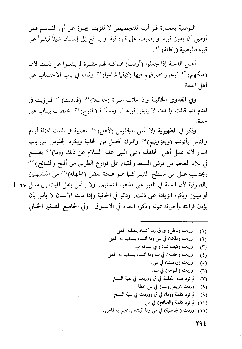 الْوَصِيَّة بعمارة قبر أَبِيه للتجصيص لَا للزِّينَة يجوز عَن أبي الْقَاسِم فَمن أوصى أَن يطين قَبره أَو يضْرب على قَبره قبَّة أَو يدْفع إِلَى إِنْسَان شَيْئا ليقْرَأ على قَبره فَالْوَصِيَّة بَاطِلَة