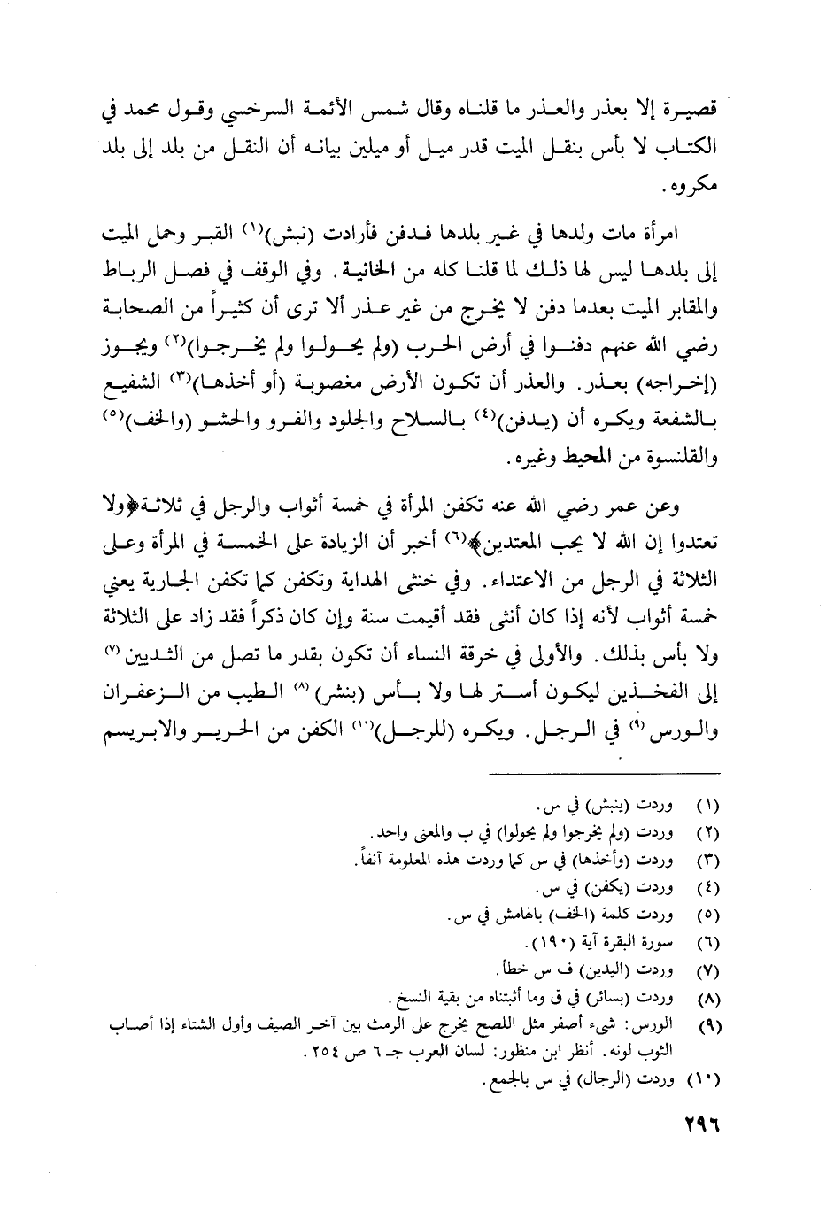 وَعَن عمر رَضِي الله عَنهُ تكفن الْمَرْأَة فِي خَمْسَة أَثوَاب وَالرجل فِي ثَلَاثَة {وَلَا تَعْتَدوا إِن الله لَا يحب الْمُعْتَدِينَ} أخبر أَن الزِّيَادَة على الْخَمْسَة فِي الْمَرْأَة وعَلى الثَّلَاثَة فِي الرجل من الاعتداء وَفِي خُنْثَى الْهِدَايَة وتكفن كَمَا تكفن الْجَارِيَة يَعْنِي خَمْسَة أَثوَاب لِأَنَّهُ إِذا كَانَ أُنْثَى فقد أُقِيمَت سنة وَإِن كَانَ ذكرا فقد زَاد على الثَّلَاثَة وَلَا بَأْس بذلك وَالْأولَى فِي خرقَة النِّسَاء أَن تكون بِقدر مَا تصل من الثديين إِلَى الفخذين ليَكُون أستر لَهَا وَلَا بَأْس بنشر الطّيب من الزَّعْفَرَان والورس فِي الرجل وَيكرهُ للرجل الْكَفَن من الْحَرِير والابريسم