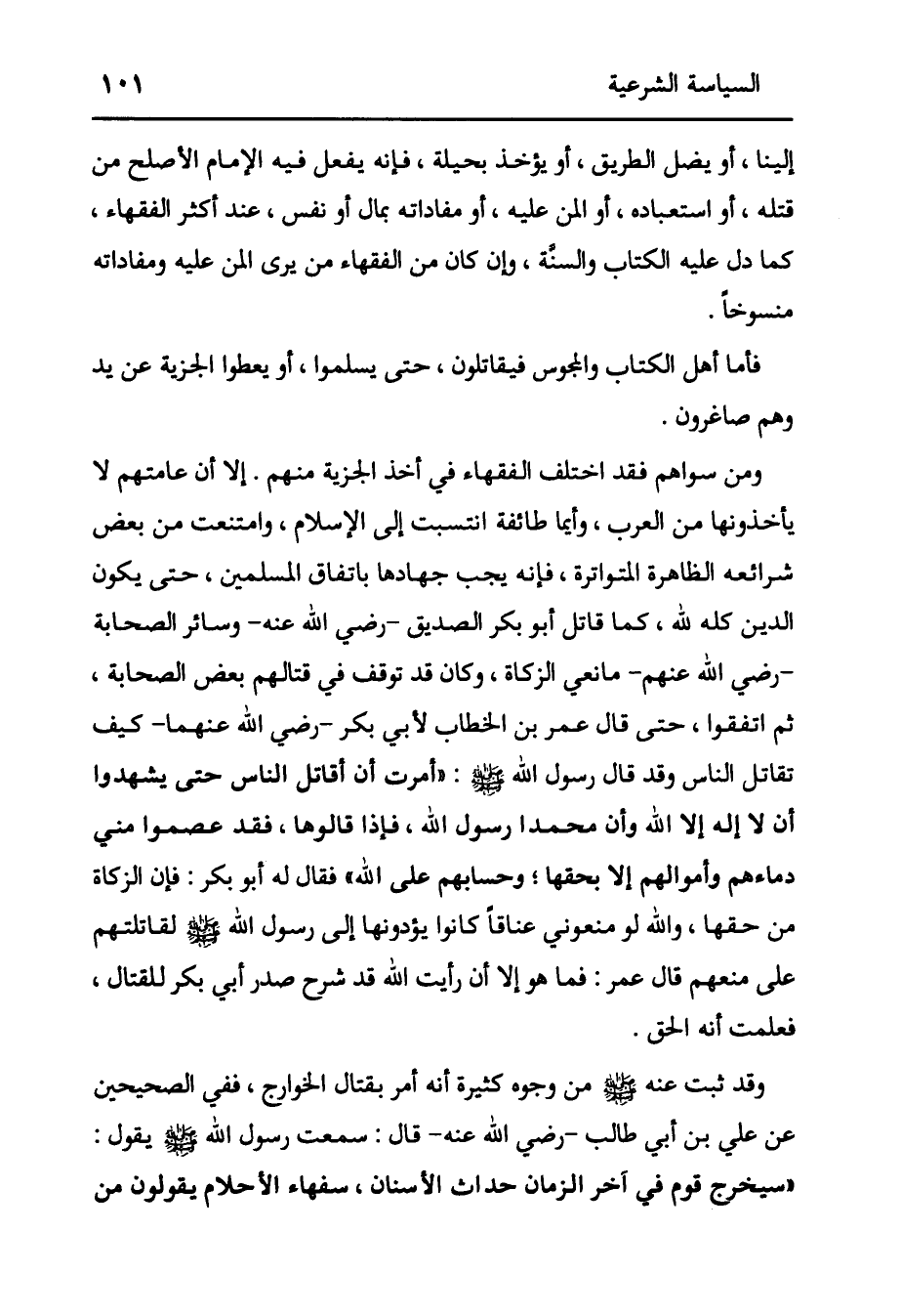 إلَيْنَا، أَوْ يَضِلَّ الطَّرِيقَ، أَوْ يُؤْخَذَ بِحِيلَةٍ، فَإِنَّهُ يَفْعَلُ فِيهِ الْإِمَامُ الْأَصْلَحَ مِنْ قَتْلِهِ، أَوْ اسْتِعْبَادِهِ، أَوْ الْمَنِّ عَلَيْهِ، أَوْ مُفَادَاتِهِ بِمَالٍ أَوْ نَفْسٍ، عِنْدَ أَكْثَرِ الْفُقَهَاءِ، كَمَا دَلَّ عَلَيْهِ الْكِتَابُ وَالسُّنَّةُ، وَإِنْ كَانَ مِنْ الْفُقَهَاءِ مَنْ يَرَى الْمَنَّ عَلَيْهِ وَمُفَادَاتَهُ مَنْسُوخًا. فَأَمَّا أَهْلُ الْكِتَابِ وَالْمَجُوسُ فَيُقَاتَلُونَ، حَتَّى يُسْلِمُوا، أَوْ يُعْطُوا الْجِزْيَةَ عَنْ يَدٍ وَهُمْ صَاغِرُونَ. وَمَنْ سِوَاهُمْ فَقَدْ اخْتَلَفَ الْفُقَهَاءُ فِي أَخْذِ الْجِزْيَةِ مِنْهُمْ. إلَّا أَنَّ عَامَّتَهُمْ لَا يَأْخُذُونَهَا من العرب، وأيما طائفة انْتَسَبَتْ إلَى الْإِسْلَامِ، وَامْتَنَعَتْ مِنْ بَعْضِ شَرَائِعِهِ الظَّاهِرَةِ الْمُتَوَاتِرَةِ، فَإِنَّهُ يَجِبُ جِهَادُهَا بِاتِّفَاقِ الْمُسْلِمِينَ، حَتَّى يَكُونَ الدِّينُ كُلُّهُ لِلَّهِ، كَمَا قَاتَلَ أَبُو بَكْرٍ الصِّدِّيقُ -رَضِيَ اللَّهُ عَنْهُ- وَسَائِرُ الصَّحَابَةِ -رَضِيَ اللَّهُ عَنْهُمْ- مَانِعِي الزَّكَاةِ، وَكَانَ قَدْ تَوَقَّفَ فِي قِتَالِهِمْ بَعْضُ الصَّحَابَةِ، ثُمَّ اتَّفَقُوا، حَتَّى قَالَ عُمَرُ بْنُ الْخَطَّابِ لِأَبِي بكر -رضي الله عَنْهُمَا- كَيْفَ تُقَاتِلُ النَّاسَ وَقَدْ قَالَ رَسُولُ اللَّهِ صَلَّى اللَّهُ عَلَيْهِ وَسَلَّمَ: «أُمِرْتُ أَنْ أُقَاتِلَ النَّاسَ حَتَّى يَشْهَدُوا أَنْ لَا إلَهَ إلَّا اللَّهُ وَأَنَّ مُحَمَّدًا رَسُولُ اللَّهِ، فَإِذَا قَالُوهَا، فَقَدْ عَصَمُوا مِنِّي دِمَاءَهُمْ وَأَمْوَالَهُمْ إلَّا بِحَقِّهَا؛ وَحِسَابُهُمْ عَلَى اللَّهِ» ، فَقَالَ لَهُ أَبُو بَكْرٍ: فَإِنَّ الزَّكَاةَ مِنْ حَقِّهَا، وَاَللَّهِ لَوْ مَنَعُونِي عَنَاقًا كَانُوا يُؤَدُّونَهَا إلَى رَسُولِ اللَّهِ صلى الله عليه وسلم لقاتلتهم على منعهم قَالَ عُمَرُ: فَمَا هُوَ إلَّا أَنْ رَأَيْتُ اللَّهَ قَدْ شَرَحَ صَدْرَ أَبِي بَكْرٍ لِلْقِتَالِ، فَعَلِمْتُ أَنَّهُ الْحَقُّ. وَقَدْ ثَبَتَ عَنْهُ صَلَّى اللَّهُ عَلَيْهِ وَسَلَّمَ مِنْ وُجُوهٍ كَثِيرَةٍ أَنَّهُ أَمَرَ بِقِتَالِ الْخَوَارِجِ، فَفِي الصَّحِيحَيْنِ عَنْ عَلِيِّ بْنِ أَبِي طَالِبٍ -رَضِيَ اللَّهُ عَنْهُ- قَالَ: سَمِعْتُ رَسُولَ اللَّهِ صَلَّى اللَّهُ عَلَيْهِ وَسَلَّمَ يقول: «سيخرج قوم في آخر الزمان حداث الْأَسْنَانِ، سُفَهَاءُ الْأَحْلَامِ يَقُولُونَ مِنْ