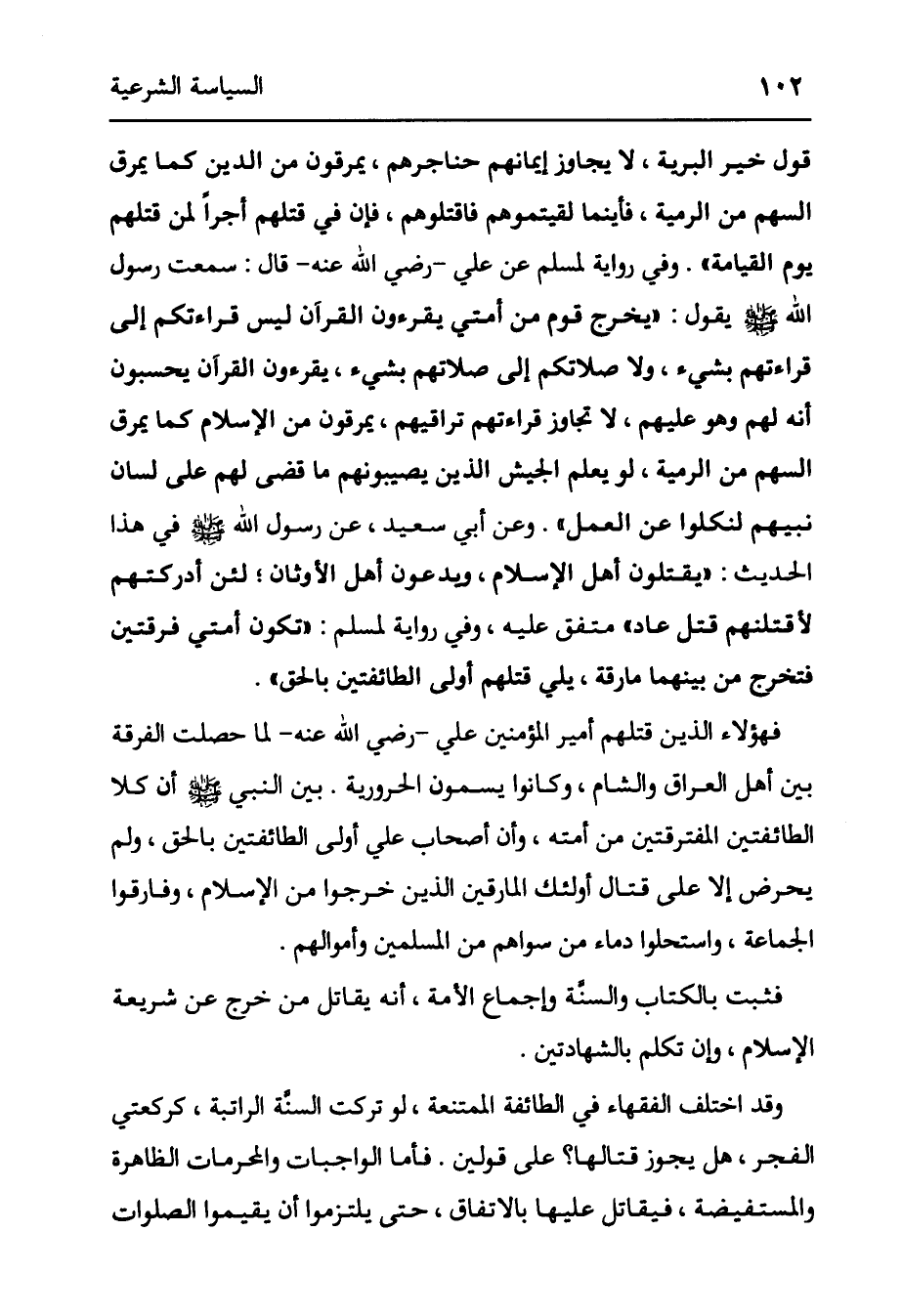 قَوْلِ خَيْرِ الْبَرِيَّةِ، لَا يُجَاوِزُ إيمَانُهُمْ حَنَاجِرَهُمْ، يَمْرُقُونَ مِنْ الدِّينِ كَمَا يَمْرُقُ السَّهْمُ مِنْ الرَّمْيَةِ، فَأَيْنَمَا لَقِيتُمُوهُمْ فَاقْتُلُوهُمْ، فَإِنَّ فِي قَتْلِهِمْ أَجْرًا لِمَنْ قَتَلَهُمْ يَوْمَ الْقِيَامَةِ» . وَفِي رِوَايَةٍ لِمُسْلِمٍ عَنْ عَلِيٍّ -رَضِيَ اللَّهُ عَنْهُ- قَالَ: سَمِعْتُ رَسُولَ اللَّهِ صَلَّى اللَّهُ عَلَيْهِ وَسَلَّمَ يَقُولُ: «يَخْرُجُ قَوْمٌ مِنْ أُمَّتِي يَقْرَءُونَ الْقُرْآنَ لَيْسَ قِرَاءَتُكُمْ إلَى قِرَاءَتِهِمْ بِشَيْءٍ، وَلَا صَلَاتُكُمْ إلى صلاتهم بشيء، يقرءون القرآن يحسبون أَنَّهُ لَهُمْ وَهُوَ عَلَيْهِمْ، لَا تُجَاوِزُ قِرَاءَتُهُمْ تَرَاقِيَهُمْ، يَمْرُقُونَ مِنْ الْإِسْلَامِ كَمَا يَمْرُقُ السَّهْمُ مِنْ الرَّمِيَّةِ، لَوْ يَعْلَمُ الْجَيْشُ الَّذِينَ يُصِيبُونَهُمْ ما قضى لهم على لسان نبيهم لنكلوا عن الْعَمَلِ» . وَعَنْ أَبِي سَعِيدٍ، عَنْ رَسُولِ اللَّهِ صَلَّى اللَّهُ عَلَيْهِ وَسَلَّمَ فِي هَذَا الْحَدِيثِ: «يقتلون أهل الإسلام، وَيَدَعُونَ أَهْلَ الْأَوْثَانِ؛ لَئِنْ أَدْرَكْتُهُمْ لَأَقْتُلَنَّهُمْ قَتْلَ عَادٍ» مُتَّفَقٌ عَلَيْهِ، وَفِي رِوَايَةٍ لِمُسْلِمٍ: «تَكُونُ أُمَّتِي فِرْقَتَيْنِ فَتَخْرُجُ مِنْ بَيْنِهِمَا مَارِقَةٌ، يَلِي قَتْلَهُمْ أَوْلَى الطَّائِفَتَيْنِ بِالْحَقِّ» . فَهَؤُلَاءِ الَّذِينَ قَتَلَهُمْ أَمِيرُ الْمُؤْمِنِينَ عَلِيٌّ -رَضِيَ اللَّهُ عَنْهُ- لَمَّا حَصَلَتْ الْفُرْقَةُ بَيْنَ أَهْلِ الْعِرَاقِ وَالشَّامِ، وَكَانُوا يُسَمَّوْنَ الْحَرُورِيَّةَ. بَيَّنَ النَّبِيُّ صَلَّى اللَّهُ عَلَيْهِ وَسَلَّمَ أَنَّ كِلَا الطَّائِفَتَيْنِ الْمُفْتَرِقَتَيْنِ مِنْ أُمَّتِهِ، وأن أصحاب علي أولى الطائفتين بِالْحَقِّ، وَلَمْ يُحَرِّضْ إلَّا عَلَى قِتَالِ أُولَئِكَ الْمَارِقِينَ الَّذِينَ خَرَجُوا مِنْ الْإِسْلَامِ، وَفَارَقُوا الْجَمَاعَةَ، وَاسْتَحَلُّوا دِمَاءَ مَنْ سِوَاهُمْ مِنْ الْمُسْلِمِينَ وَأَمْوَالِهِمْ. فَثَبَتَ بِالْكِتَابِ وَالسُّنَّةِ وَإِجْمَاعِ الْأُمَّةِ، أَنَّهُ يُقَاتَلُ مَنْ خَرَجَ عَنْ شَرِيعَةِ الْإِسْلَامِ، وَإِنْ تَكَلَّمَ بِالشَّهَادَتَيْنِ. وَقَدْ اخْتَلَفَ الْفُقَهَاءُ فِي الطَّائِفَةِ الْمُمْتَنِعَةِ، لَوْ تَرَكَتْ السُّنَّةَ الرَّاتِبَةَ، كَرَكْعَتَيْ الْفَجْرِ، هَلْ يجوز قتالها؛ على قولين. فأما الواجبات والحرمات الظَّاهِرَةُ وَالْمُسْتَفِيضَةُ، فَيُقَاتَلُ عَلَيْهَا بِالِاتِّفَاقِ، حَتَّى يَلْتَزِمُوا أَنْ يُقِيمُوا الصَّلَوَاتِ
