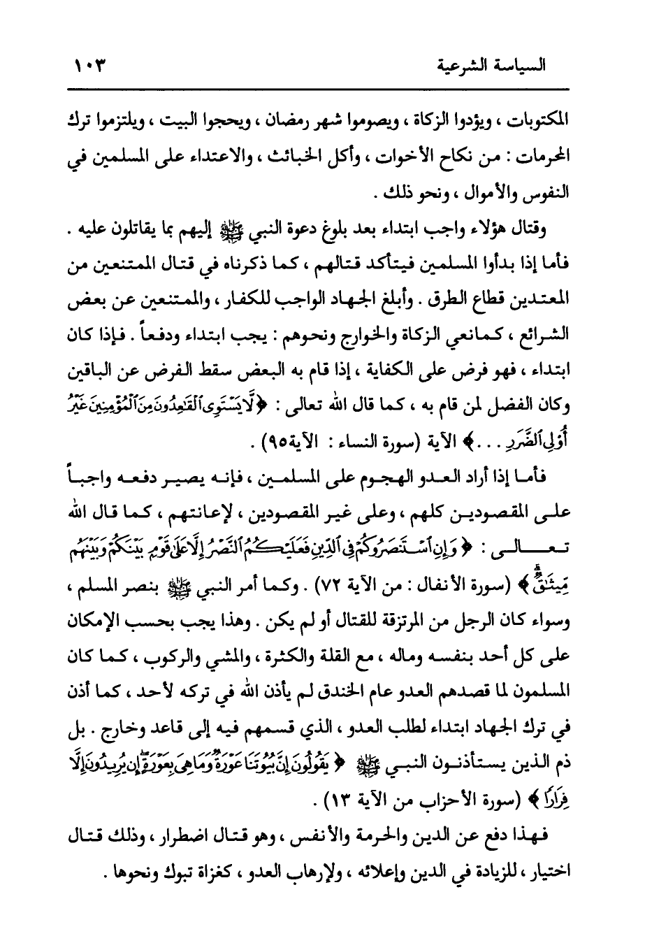 الْمَكْتُوبَاتِ، وَيُؤَدُّوا الزَّكَاةَ، وَيَصُومُوا شَهْرَ رَمَضَانَ، وَيَحُجُّوا الْبَيْتَ، وَيَلْتَزِمُوا تَرْكَ الْمُحَرَّمَاتِ: مِنْ نِكَاحِ الْأَخَوَاتِ، وَأَكْلِ الْخَبَائِثِ، وَالِاعْتِدَاءِ عَلَى الْمُسْلِمِينَ فِي النُّفُوسِ وَالْأَمْوَالِ، وَنَحْوِ ذَلِكَ. وَقِتَالُ هَؤُلَاءِ وَاجِبٌ ابْتِدَاءً بَعْدَ بُلُوغِ دَعْوَةِ النَّبِيِّ صَلَّى اللَّهُ عَلَيْهِ وسلم إليهم بما يقاتلون عليه. فأما إذا بدأوا الْمُسْلِمِينَ فَيَتَأَكَّدُ قِتَالُهُمْ، كَمَا ذَكَرْنَاهُ فِي قِتَالِ الْمُمْتَنِعِينَ مِنْ الْمُعْتَدِينَ قُطَّاعِ الطُّرُقِ. وَأَبْلَغُ الْجِهَادِ الْوَاجِبُ لِلْكُفَّارِ، وَالْمُمْتَنِعِينَ عَنْ بَعْضِ الشَّرَائِعِ، كَمَانِعِي الزَّكَاةِ وَالْخَوَارِجِ وَنَحْوِهِمْ: يَجِبُ ابْتِدَاءً وَدَفْعًا. فَإِذَا كَانَ ابْتِدَاءً، فَهُوَ فَرْضٌ عَلَى الْكِفَايَةِ، إذَا قَامَ بِهِ الْبَعْضُ سَقَطَ الْفَرْضُ عَنْ الْبَاقِينَ وَكَانَ الْفَضْلُ لِمَنْ قَامَ بِهِ، كَمَا قَالَ اللَّهُ تَعَالَى: {لَا يَسْتَوِي الْقَاعِدُونَ مِنَ الْمُؤْمِنِينَ غَيْرُ أُولِي الضَّرَرِ} [النساء: 95] الآية (سورة النساء: الْآيَةَ 95) . فَأَمَّا إذَا أَرَادَ الْعَدُوُّ الْهُجُومَ عَلَى الْمُسْلِمِينَ، فَإِنَّهُ يَصِيرُ دَفْعُهُ وَاجِبًا عَلَى الْمَقْصُودِينَ كُلِّهِمْ، وَعَلَى غَيْرِ الْمَقْصُودِينَ، لِإِعَانَتِهِمْ، كَمَا قَالَ اللَّهُ تَعَالَى: {وَإِنِ اسْتَنْصَرُوكُمْ فِي الدِّينِ فَعَلَيْكُمُ النَّصْرُ إِلَّا عَلَى قَوْمٍ بَيْنَكُمْ وَبَيْنَهُمْ مِيثَاقٌ} [الأنفال: 72] (سورة الأنفال: من الآية 72) . وَكَمَا أَمَرَ النَّبِيُّ صَلَّى اللَّهُ عَلَيْهِ وَسَلَّمَ بنصر المسلم، وسواء كان الرَّجُلُ مِنْ الْمُرْتَزِقَةِ لِلْقِتَالِ أَوْ لَمْ يَكُنْ. وَهَذَا يَجِبُ بِحَسَبِ الْإِمْكَانِ عَلَى كُلِّ أَحَدٍ بِنَفْسِهِ وَمَالِهِ، مَعَ الْقِلَّةِ وَالْكَثْرَةِ، وَالْمَشْيِ وَالرُّكُوبِ، كَمَا كَانَ الْمُسْلِمُونَ لَمَّا قَصَدَهُمْ الْعَدُوُّ عَامَ الخندق لم يأذن الله في ترى لأحد، كَمَا أَذِنَ فِي تَرْكِ الْجِهَادِ ابْتِدَاءً لِطَلَبِ الْعَدُوِّ، الَّذِي قَسَّمَهُمْ فِيهِ إلَى قَاعِدٍ وَخَارِجٍ. بَلْ ذَمَّ الَّذِينَ يَسْتَأْذِنُونَ النَّبِيَّ صَلَّى اللَّهُ عَلَيْهِ وَسَلَّمَ {يَقُولُونَ إِنَّ بُيُوتَنَا عَوْرَةٌ وَمَا هِيَ بِعَوْرَةٍ إِنْ يُرِيدُونَ إِلَّا فِرَارًا} [الأحزاب: 13] (سورة الأحزاب من الآية 13) . فَهَذَا دَفْعٌ عَنْ الدِّينِ وَالْحُرْمَةِ وَالْأَنْفُسِ، وَهُوَ قِتَالُ اضْطِرَارٍ، وَذَلِكَ قِتَالُ اخْتِيَارٍ، لِلزِّيَادَةِ فِي الدِّينِ وَإِعْلَائِهِ، وَلِإِرْهَابِ الْعَدُوِّ، كَغُزَاةِ تَبُوكَ وَنَحْوِهَا.