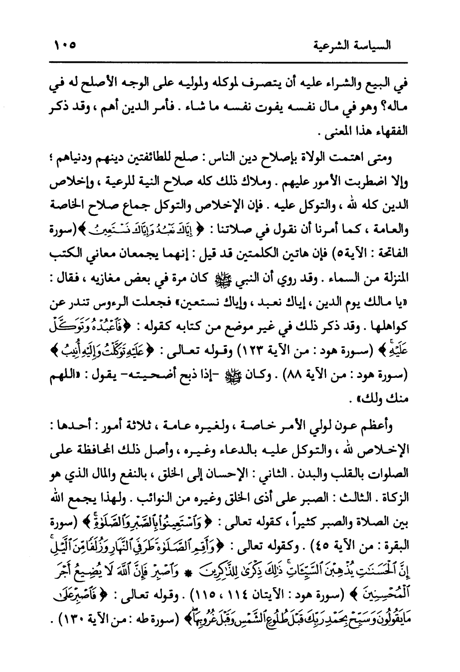 فِي الْبَيْعِ وَالشِّرَاءِ عَلَيْهِ أَنْ يِتصرف لِمُوَكِّلِهِ وَلِمُوَلِّيهِ عَلَى الْوَجْهِ الْأَصْلَحِ لَهُ فِي مَالِهِ؟ وَهُوَ فِي مَالِ نَفْسِهِ يَفُوتُ نَفْسَهُ مَا شَاءَ. فَأَمْرُ الدِّينِ أَهَمُّ، وَقَدْ ذَكَرَ الْفُقَهَاءُ هَذَا الْمَعْنَى. وَمَتَى اهْتَمَّتْ الْوُلَاةُ بِإِصْلَاحِ دِينِ النَّاسِ: صَلُحَ لِلطَّائِفَتَيْنِ دِينُهُمْ وَدُنْيَاهُمْ؛ وَإِلَّا اضْطَرَبَتْ الأمور عليهم. وملاك ذلك كله صلاح النِّيَّةِ لِلرَّعِيَّةِ، وَإِخْلَاصُ الدِّينِ كُلِّهِ لِلَّهِ، وَالتَّوَكُّلُ عَلَيْهِ. فَإِنَّ الْإِخْلَاصَ وَالتَّوَكُّلَ جِمَاعُ صَلَاحِ الْخَاصَّةِ وَالْعَامَّةِ، كَمَا أَمَرَنَا أَنْ نَقُولَ فِي صَلَاتِنَا: {إِيَّاكَ نَعْبُدُ وَإِيَّاكَ نَسْتَعِينُ} [الفاتحة: 5] (سورة الفاتحة: الآية 5) فَإِنَّ هَاتَيْنِ الْكَلِمَتَيْنِ قَدْ قِيلَ: إنَّهُمَا يَجْمَعَانِ مَعَانِيَ الْكُتُبِ الْمُنَزَّلَةِ مِنْ السَّمَاءِ. وَقَدْ رُوِيَ «أَنَّ النَّبِيَّ صَلَّى اللَّهُ عَلَيْهِ وَسَلَّمَ كَانَ مَرَّةً فِي بَعْضِ مَغَازِيهِ، فَقَالَ: " يَا مَالِكَ يَوْمِ الدِّينِ، إيَّاكَ نَعْبُدُ، وَإِيَّاكَ نَسْتَعِينُ " فَجُعِلَتْ الرُّءُوسُ تَنْدُرُ عَنْ كَوَاهِلِهَا» . وَقَدْ ذُكِرَ ذَلِكَ فِي غَيْرِ مَوْضِعٍ مِنْ كِتَابِهِ كَقَوْلِهِ: {فَاعْبُدْهُ وَتَوَكَّلْ عَلَيْهِ} [هود: 123] (سورة هود: من الآية 123) وقَوْله تَعَالَى: {عَلَيْهِ تَوَكَّلْتُ وَإِلَيْهِ أُنِيبُ} [هود: 88] (سورة هود: من الآية 88) . «وكان صَلَّى اللَّهُ عَلَيْهِ وَسَلَّمَ إذَا ذَبَحَ أُضْحِيَّتَهُ -يَقُولُ: " اللَّهُمَّ مِنْكَ وَلَكَ» . وَأَعْظُمُ عَوْنٍ لِوَلِيِّ الْأَمْرِ خَاصَّةً، وَلِغَيْرِهِ عَامَّةً، ثَلَاثَةُ أُمُورٍ: أَحَدُهَا: الْإِخْلَاصُ لِلَّهِ، وَالتَّوَكُّلُ عَلَيْهِ بِالدُّعَاءِ وَغَيْرِهِ، وَأَصْلُ ذلك المحافظة على الصلوات بالقلب والبدن. الثاني: الْإِحْسَانُ إلَى الْخَلْقِ، بِالنَّفْعِ وَالْمَالِ الَّذِي هُوَ الزَّكَاةُ. الثَّالِثُ: الصَّبْرُ عَلَى أَذَى الْخَلْقِ وَغَيْرِهِ من النوائب. ولهذا يجمع الله بين الصلاة والصبر كثيراً، كقوله تعالى: {وَاسْتَعِينُوا بِالصَّبْرِ وَالصَّلَاةِ} [البقرة: 45] (سورة البقرة: من الآية 45) . وَكَقَوْلِهِ تَعَالَى: {وَأَقِمِ الصَّلَاةَ طَرَفَيِ النَّهَارِ وَزُلَفًا مِنَ اللَّيْلِ إِنَّ الْحَسَنَاتِ يُذْهِبْنَ السَّيِّئَاتِ ذَلِكَ ذِكْرَى لِلذَّاكِرِينَ - وَاصْبِرْ فَإِنَّ اللَّهَ لَا يُضِيعُ أَجْرَ الْمُحْسِنِينَ} [هود: 114 - 115] (سورة هود: الأيتان 114، 115) . وقَوْله تَعَالَى: {فَاصْبِرْ عَلَى مَا يَقُولُونَ وَسَبِّحْ بِحَمْدِ رَبِّكَ قَبْلَ طُلُوعِ الشَّمْسِ وَقَبْلَ غُرُوبِهَا} [طه: 130] (سورة طه: من الآية 130) .