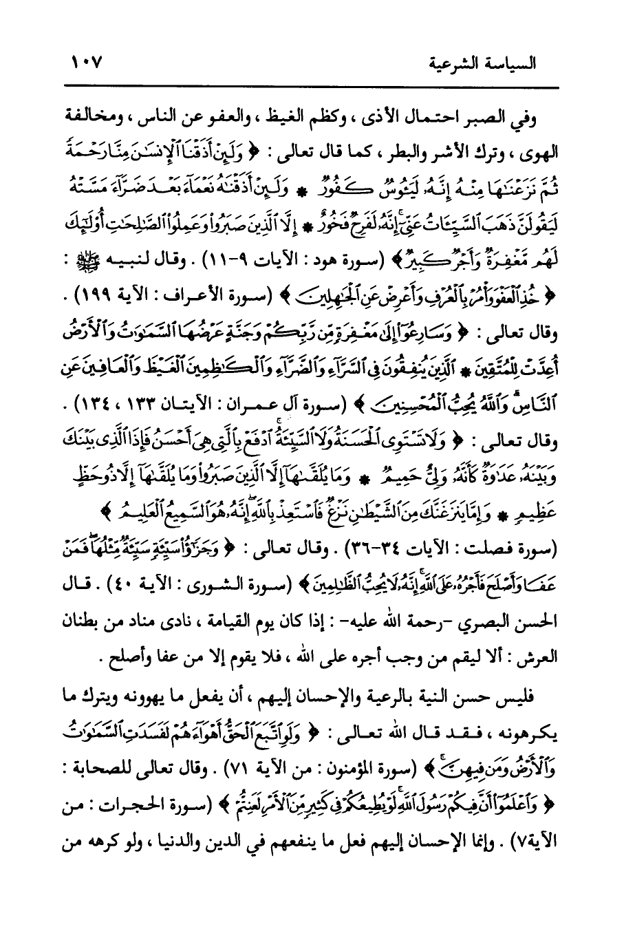 وَفِي الصَّبْرِ احْتِمَالُ الْأَذَى، وَكَظْمُ الْغَيْظِ، وَالْعَفْوُ عَنْ النَّاسِ، وَمُخَالَفَةُ الْهَوَى، وَتَرْكُ الْأَشِرِ وَالْبَطَرِ، كَمَا قَالَ تَعَالَى: {وَلَئِنْ أَذَقْنَا الْإِنْسَانَ مِنَّا رَحْمَةً ثُمَّ نَزَعْنَاهَا مِنْهُ إِنَّهُ لَيَئُوسٌ كَفُورٌ - وَلَئِنْ أَذَقْنَاهُ نَعْمَاءَ بَعْدَ ضَرَّاءَ مَسَّتْهُ لَيَقُولَنَّ ذَهَبَ السَّيِّئَاتُ عَنِّي إِنَّهُ لَفَرِحٌ فَخُورٌ - إِلَّا الَّذِينَ صَبَرُوا وَعَمِلُوا الصَّالِحَاتِ أُولَئِكَ لَهُمْ مَغْفِرَةٌ وَأَجْرٌ كَبِيرٌ} [هود: 9 - 11] (سورة هود: الآيات 9- 11) . وَقَالَ لِنَبِيِّهِ صَلَّى اللَّهُ عَلَيْهِ وَسَلَّمَ: {خُذِ الْعَفْوَ وَأْمُرْ بِالْعُرْفِ وَأَعْرِضْ عَنِ الْجَاهِلِينَ} [الأعراف: 199] (سورة الأعراف: الآية 199) . وَقَالَ تَعَالَى: {وَسَارِعُوا إِلَى مَغْفِرَةٍ مِنْ رَبِّكُمْ وَجَنَّةٍ عَرْضُهَا السَّمَاوَاتُ وَالْأَرْضُ أُعِدَّتْ لِلْمُتَّقِينَ - الَّذِينَ يُنْفِقُونَ فِي السَّرَّاءِ وَالضَّرَّاءِ وَالْكَاظِمِينَ الْغَيْظَ وَالْعَافِينَ عَنِ النَّاسِ وَاللَّهُ يُحِبُّ الْمُحْسِنِينَ} [آل عمران: 133 - 134] (سورة آل عمران: الآيتان 133، 134) . وَقَالَ تَعَالَى: {وَلَا تَسْتَوِي الْحَسَنَةُ وَلَا السَّيِّئَةُ ادْفَعْ بِالَّتِي هِيَ أَحْسَنُ فَإِذَا الَّذِي بَيْنَكَ وَبَيْنَهُ عَدَاوَةٌ كَأَنَّهُ وَلِيٌّ حَمِيمٌ - وَمَا يُلَقَّاهَا إِلَّا الَّذِينَ صَبَرُوا وَمَا يُلَقَّاهَا إِلَّا ذُو حَظٍّ عَظِيمٍ - وَإِمَّا يَنْزَغَنَّكَ مِنَ الشَّيْطَانِ نَزْغٌ فَاسْتَعِذْ بِاللَّهِ إِنَّهُ هُوَ السَّمِيعُ الْعَلِيمُ} [فصلت: 34 - 36] (سورة فصلت: الآيات 34-36) . وَقَالَ تَعَالَى: {وَجَزَاءُ سَيِّئَةٍ سَيِّئَةٌ مِثْلُهَا فَمَنْ عَفَا وَأَصْلَحَ فَأَجْرُهُ عَلَى اللَّهِ إِنَّهُ لَا يُحِبُّ الظَّالِمِينَ} [الشورى: 40] (سورة الشورى: الآية 40) . قال الْحَسَنُ الْبَصْرِيُّ -رَحْمَةُ اللَّهِ عَلَيْهِ-: إذَا كَانَ يَوْمُ الْقِيَامَةِ، نَادَى مُنَادٍ مِنْ بُطْنَانِ الْعَرْشِ: أَلَا لِيَقُمْ مَنْ وَجَبَ أَجْرُهُ عَلَى اللَّهِ، فَلَا يَقُومُ إلَّا مَنْ عَفَا وَأَصْلَحَ. فَلَيْسَ حَسَنُ النِّيَّةِ بِالرَّعِيَّةِ وَالْإِحْسَانُ إلَيْهِمْ، أَنْ يَفْعَلَ مَا يَهْوُونَهُ وَيَتْرُكَ مَا يَكْرَهُونَهُ، فَقَدْ قَالَ اللَّهُ تَعَالَى: {وَلَوِ اتَّبَعَ الْحَقُّ أَهْوَاءَهُمْ لَفَسَدَتِ السَّمَاوَاتُ وَالْأَرْضُ وَمَنْ فِيهِنَّ} [المؤمنون: 71] [سورة المؤمنون: من الآية 71) . وَقَالَ تَعَالَى لِلصَّحَابَةِ: {وَاعْلَمُوا أَنَّ فِيكُمْ رَسُولَ اللَّهِ لَوْ يُطِيعُكُمْ فِي كَثِيرٍ مِنَ الْأَمْرِ لَعَنِتُّمْ} [الحجرات: 7] (سورة الحجرات: من الآية 7) . وَإِنَّمَا الْإِحْسَانُ إلَيْهِمْ فِعْلُ مَا يَنْفَعُهُمْ فِي الدِّينِ وَالدُّنْيَا، وَلَوْ كَرِهَهُ مَنْ