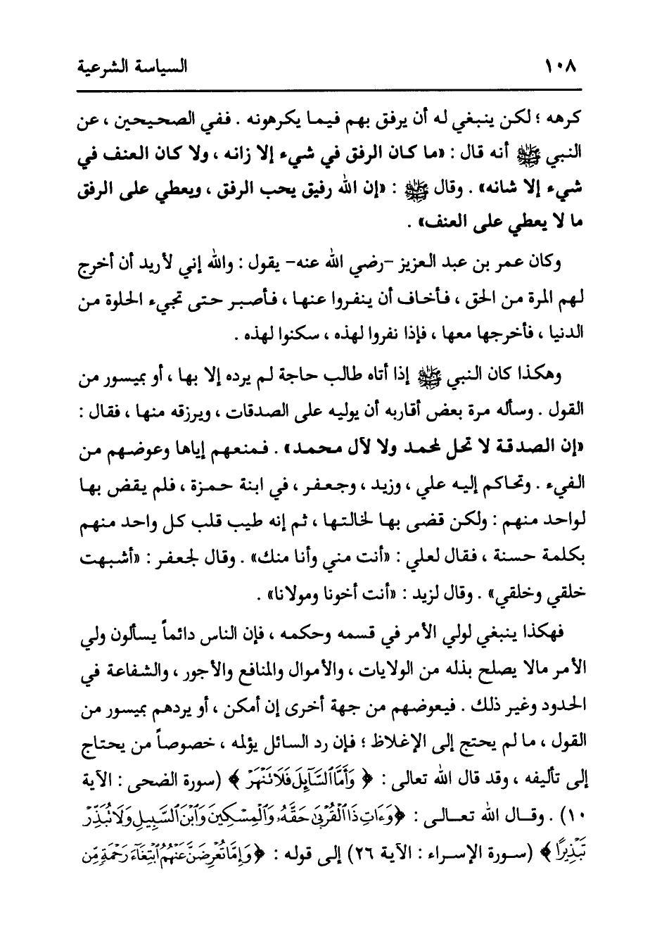 كَرِهَهُ؛ لَكِنْ يَنْبَغِي لَهُ أَنْ يَرْفُقَ بِهِمْ فِيمَا يَكْرَهُونَهُ. فَفِي الصَّحِيحَيْنِ، عَنْ النَّبِيِّ صَلَّى اللَّهُ عَلَيْهِ وَسَلَّمَ أَنَّهُ قَالَ: «مَا كَانَ الرِّفْقُ فِي شَيْءٍ إلَّا زَانَهُ، وَلَا كَانَ الْعُنْفُ فِي شَيْءٍ إلَّا شَانَهُ» . وَقَالَ صَلَّى اللَّهُ عَلَيْهِ وَسَلَّمَ: «إنَّ اللَّهَ رَفِيقٌ يُحِبُّ الرِّفْقَ، وَيُعْطِي عَلَى الرِّفْقِ مَا لَا يُعْطِي عَلَى الْعُنْفِ» . وَكَانَ عُمَرُ بْنُ عَبْدِ الْعَزِيزِ -رضي الله عنه- يقول: والله إني لأريد أَنْ أُخْرِجَ لَهُمْ الْمُرَّةَ مِنْ الْحَقِّ، فَأَخَافُ أَنْ يَنْفِرُوا عَنْهَا، فَأَصْبِرُ حَتَّى تَجِيءَ الْحُلْوَةُ مِنْ الدُّنْيَا، فَأُخْرِجُهَا مَعَهَا، فَإِذَا نَفَرُوا لِهَذِهِ، سَكَنُوا لِهَذِهِ. وَهَكَذَا كَانَ النَّبِيُّ صَلَّى اللَّهُ عَلَيْهِ وَسَلَّمَ إذَا أَتَاهُ طَالِبُ حَاجَةٍ لَمْ يَرُدَّهُ إلَّا بِهَا، أَوْ بِمَيْسُورٍ مِنْ الْقَوْلِ. «وَسَأَلَهُ مَرَّةً بَعْضُ أَقَارِبِهِ أَنْ يُوَلِّيَهُ عَلَى الصَّدَقَاتِ، وَيَرْزُقَهُ مِنْهَا، فَقَالَ: " إنَّ الصَّدَقَةَ لَا تَحِلُّ لِمُحَمَّدٍ وَلَا لِآلِ مُحَمَّدٍ» . فَمَنَعَهُمْ إيَّاهَا وَعَوَّضَهُمْ مِنْ الْفَيْءِ. وَتَحَاكَمَ إلَيْهِ عَلِيٌّ، وَزَيْدٌ، وَجَعْفَرٌ، فِي ابْنَةِ حَمْزَةَ، فَلَمْ يَقْضِ بِهَا لِوَاحِدٍ مِنْهُمْ: وَلَكِنْ قَضَى بِهَا لِخَالَتِهَا، ثُمَّ إنَّهُ طَيَّبَ قَلْبَ كُلِّ وَاحِدٍ مِنْهُمْ بِكَلِمَةٍ حَسَنَةٍ، «فَقَالَ لِعَلِيٍّ: " أَنْتَ مِنِّي وَأَنَا مِنْكَ» . «وَقَالَ لِجَعْفَرٍ: " أَشْبَهْتَ خَلْقِي وَخُلُقِي» . «وَقَالَ لِزَيْدٍ: " أَنْتَ أَخُونَا وَمَوْلَانَا» . فَهَكَذَا يَنْبَغِي لِوَلِيِّ الْأَمْرِ فِي قَسْمِهِ وَحُكْمِهِ، فَإِنَّ النَّاسَ دَائِمًا يَسْأَلُونَ ولي الأمر مالا يصلح بنقله من الولايات، والأموال والمنافع والأجور، وَالشَّفَاعَةِ فِي الْحُدُودِ وَغَيْرِ ذَلِكَ. فَيُعَوِّضُهُمْ مِنْ جِهَةٍ أُخْرَى إنْ أَمْكَنَ، أَوْ يَرُدُّهُمْ بِمَيْسُورٍ مِنْ الْقَوْلِ، مَا لَمْ يَحْتَجْ إلَى الْإِغْلَاظِ؛ فَإِنَّ رَدَّ السَّائِلِ يُؤْلِمُهُ، خُصُوصًا مَنْ يَحْتَاجُ إلَى تَأْلِيفِهِ، وَقَدْ قَالَ اللَّهُ تَعَالَى: {وَأَمَّا السَّائِلَ فَلَا تَنْهَرْ} [الضحى: 10] (سورة الضحى: الآية 10) . وقال الله تَعَالَى: {وَآتِ ذَا الْقُرْبَى حَقَّهُ وَالْمِسْكِينَ وَابْنَ السَّبِيلِ وَلَا تُبَذِّرْ تَبْذِيرًا} [الإسراء: 26] (سورة الإسراء: الآية 26) إلَى قَوْلِهِ: {وَإِمَّا تُعْرِضَنَّ عَنْهُمُ ابْتِغَاءَ رَحْمَةٍ مِنْ رَبِّكَ تَرْجُوهَا فَقُلْ لَهُمْ قَوْلًا مَيْسُورًا} [الإسراء: 28] (سورة الإسراء: الآية 28) .