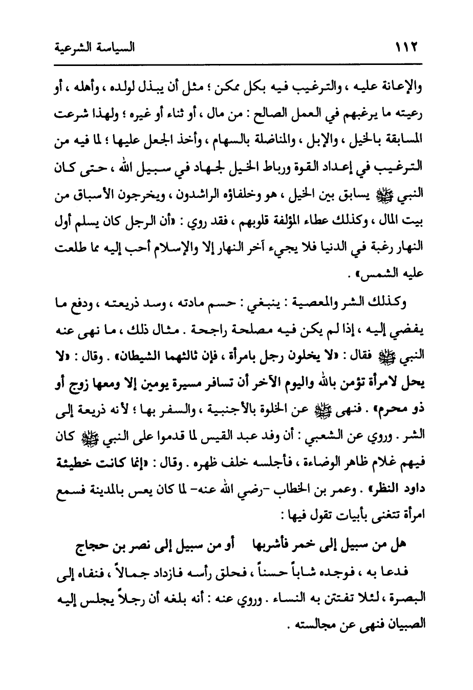 وَالْإِعَانَةُ عَلَيْهِ، وَالتَّرْغِيبُ فِيهِ بِكُلِّ مُمْكِنٍ؛ مِثْلُ أَنْ يَبْذُلَ لِوَلَدِهِ، وَأَهْلِهِ، أَوْ رَعِيَّتِهِ مَا يُرَغِّبُهُمْ فِي الْعَمَلِ الصَّالِحِ: مِنْ مَالٍ، أَوْ ثَنَاءٍ أَوْ غَيْرِهِ وَلِهَذَا شُرِعَتْ الْمُسَابَقَةُ بِالْخَيْلِ، وَالْإِبِلِ، وَالْمُنَاضَلَةُ بِالسِّهَامِ، وَأَخْذُ الْجُعْلِ عَلَيْهَا؛ لِمَا فِيهِ مِنْ التَّرْغِيبِ فِي إعْدَادِ الْقُوَّةِ وَرِبَاطِ الخيل لجهاد فِي سَبِيلِ اللَّهِ، حَتَّى كَانَ النَّبِيُّ صَلَّى اللَّهُ عَلَيْهِ وَسَلَّمَ يُسَابِقُ بَيْنَ الْخَيْلِ، هُوَ وَخُلَفَاؤُهُ الرَّاشِدُونَ، وَيُخْرِجُونَ الْأَسْبَاقَ مِنْ بَيْتِ الْمَالِ، وَكَذَلِكَ عَطَاءُ الْمُؤَلَّفَةِ قُلُوبُهُمْ، فَقَدْ رُوِيَ: " أَنَّ الرَّجُلَ كَانَ يُسْلِمُ أَوَّلَ النَّهَارِ رَغْبَةً فِي الدُّنْيَا فَلَا يَجِيءُ آخِرُ النَّهَارِ إلَّا وَالْإِسْلَامُ أَحَبُّ إلَيْهِ مِمَّا طَلَعَتْ عَلَيْهِ الشَّمْسُ ". وَكَذَلِكَ الشَّرُّ وَالْمَعْصِيَةُ: يَنْبَغِي: حَسْمُ مَادَّتِهِ، وَسَدُّ ذَرِيعَتِهِ، وَدَفْعُ مَا يُفْضِي إلَيْهِ، إذَا لَمْ يَكُنْ فِيهِ مَصْلَحَةٌ رَاجِحَةٌ. مِثَالُ ذَلِكَ، مَا نَهَى عَنْهُ النَّبِيُّ صَلَّى اللَّهُ عَلَيْهِ وَسَلَّمَ فَقَالَ: «لا يخلون رجل بِامْرَأَةٍ، فَإِنَّ ثَالِثَهُمَا الشَّيْطَانُ» . وَقَالَ: «لَا يَحِلُّ لِامْرَأَةٍ تُؤْمِنُ بِاَللَّهِ وَالْيَوْمِ الْآخِرِ أَنْ تُسَافِرَ مَسِيرَةَ يَوْمَيْنِ إلَّا وَمَعَهَا زَوْجٌ أَوْ ذُو مَحْرَمٍ» . فَنَهَى صَلَّى اللَّهُ عَلَيْهِ وَسَلَّمَ عَنْ الخلوة بِالْأَجْنَبِيَّةِ، وَالسَّفَرِ بِهَا؛ لِأَنَّهُ ذَرِيعَةٌ إلَى الشَّرِّ. وَرُوِيَ عَنْ الشَّعْبِيِّ: أَنَّ «وَفْدَ عَبْدِ الْقَيْسِ لَمَّا قَدِمُوا عَلَى النَّبِيِّ صَلَّى اللَّهُ عَلَيْهِ وَسَلَّمَ كَانَ فِيهِمْ غُلَامٌ ظَاهِرُ الْوَضَاءَةِ، فَأَجْلَسَهُ خلف ظَهْرَهُ. وَقَالَ: " إنَّمَا كَانَتْ خَطِيئَةُ دَاوُد النَّظَرَ» . وَعُمَرُ بْنُ الْخَطَّابِ -رَضِيَ اللَّهُ عَنْهُ- لَمَّا كَانَ يَعُسُّ بِالْمَدِينَةِ فَسَمِعَ امْرَأَةً تَتَغَنَّى بِأَبْيَاتٍ تَقُولُ فِيهَا: